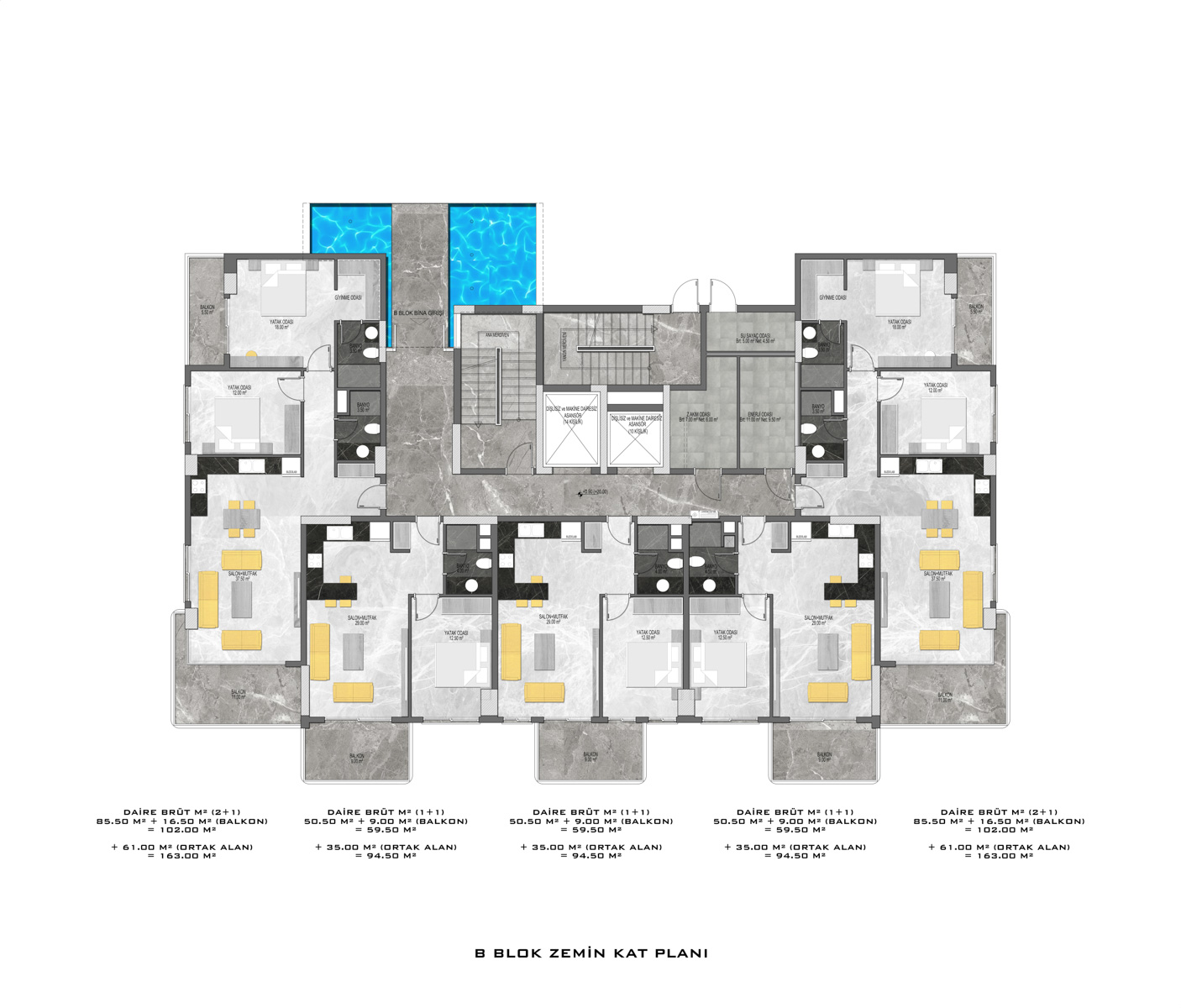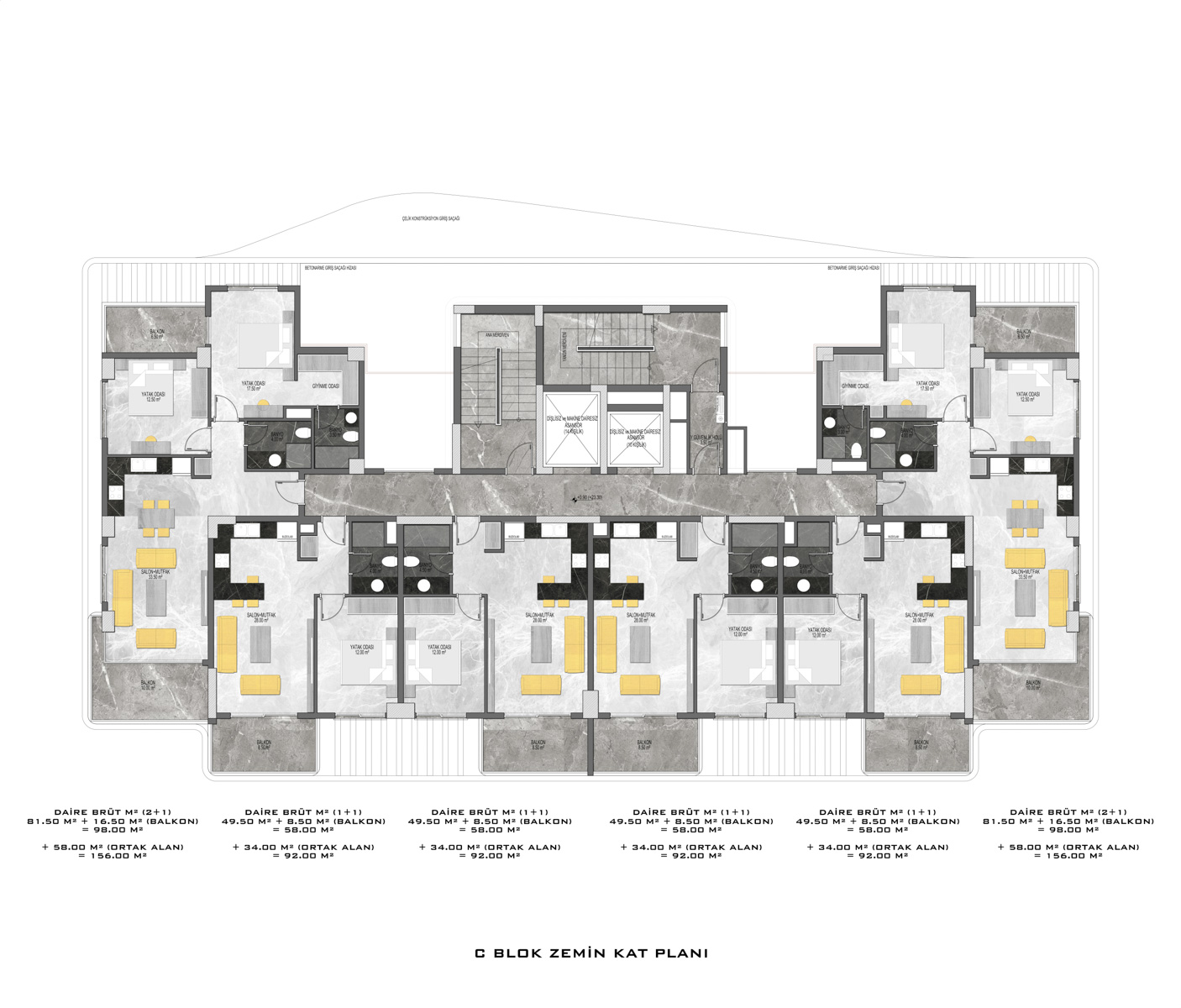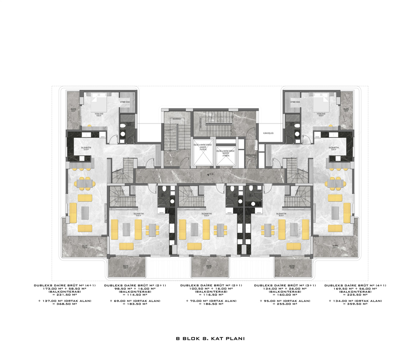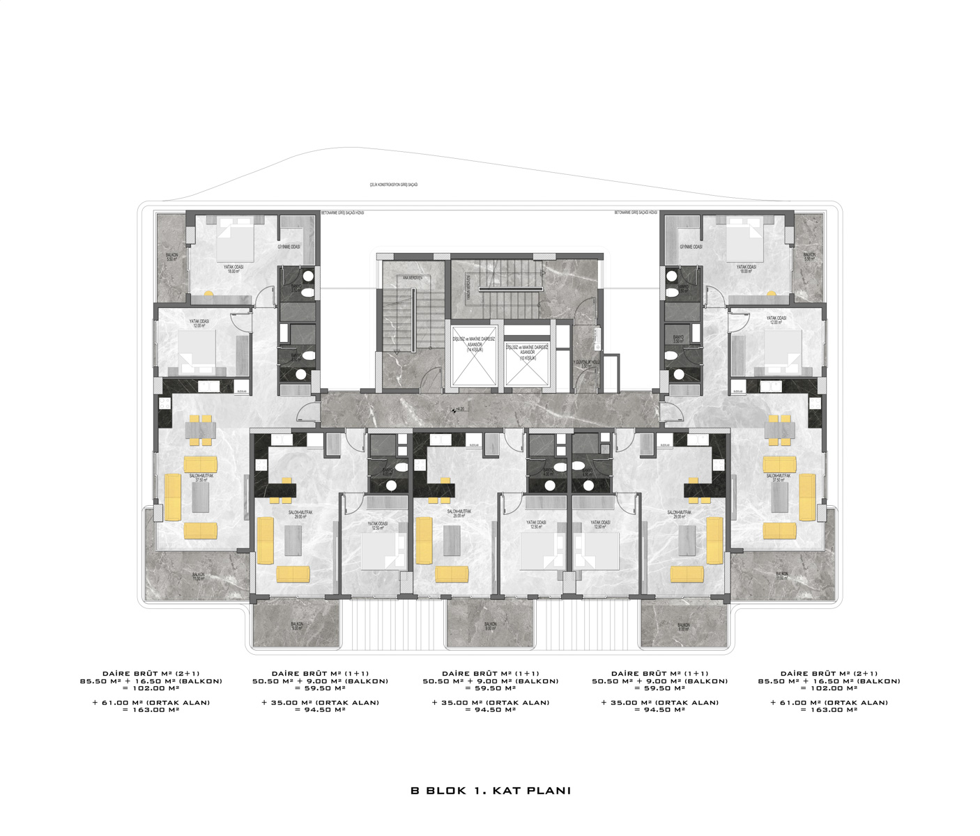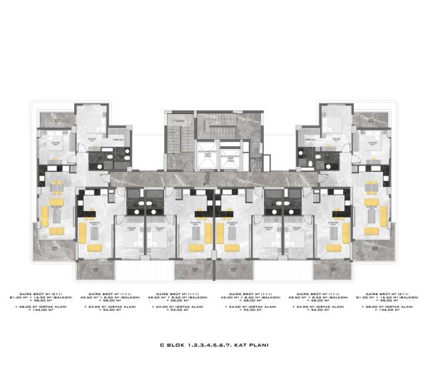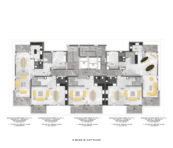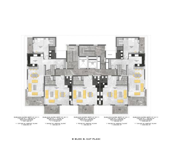 There are a total of 135 flats in 3 blocks in the complex, which was built in accordance with European standards by using first class materials and modern technologies on a 6678 m2 landscaped area.