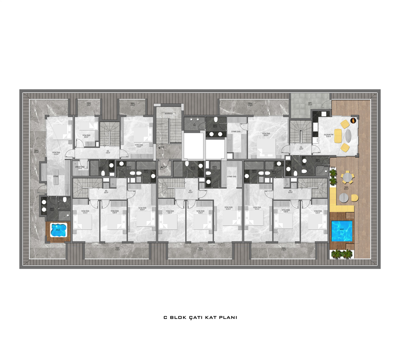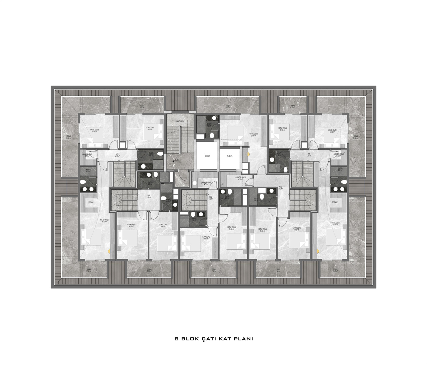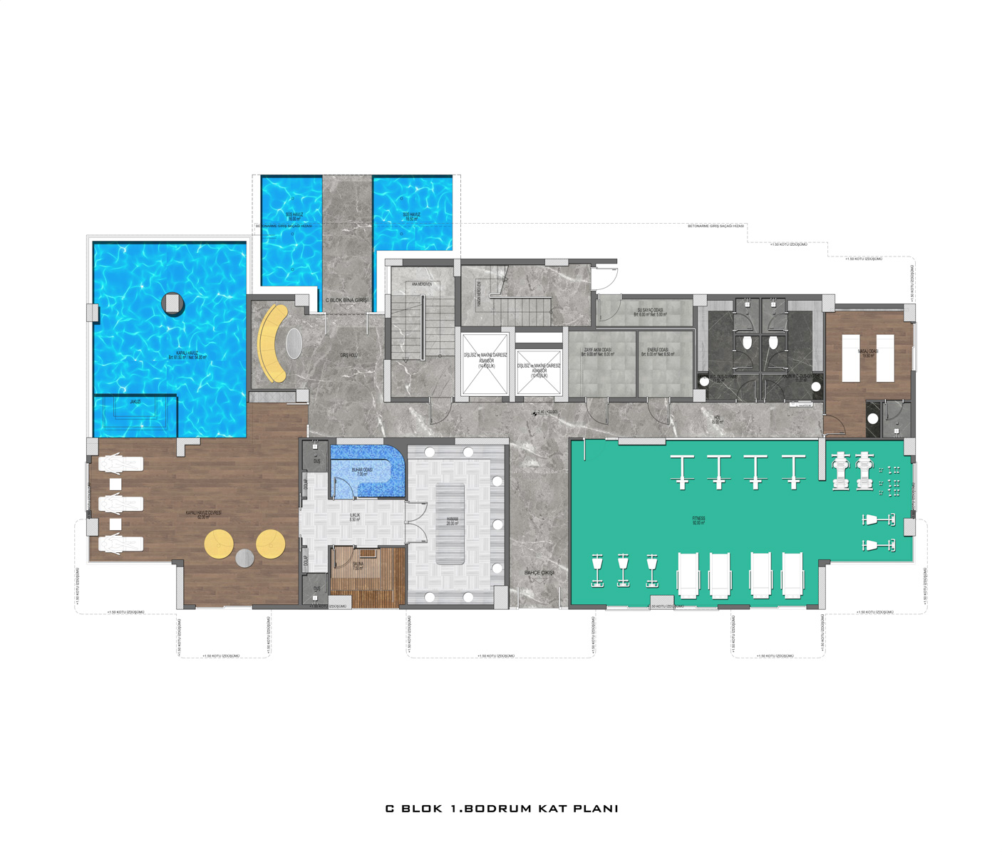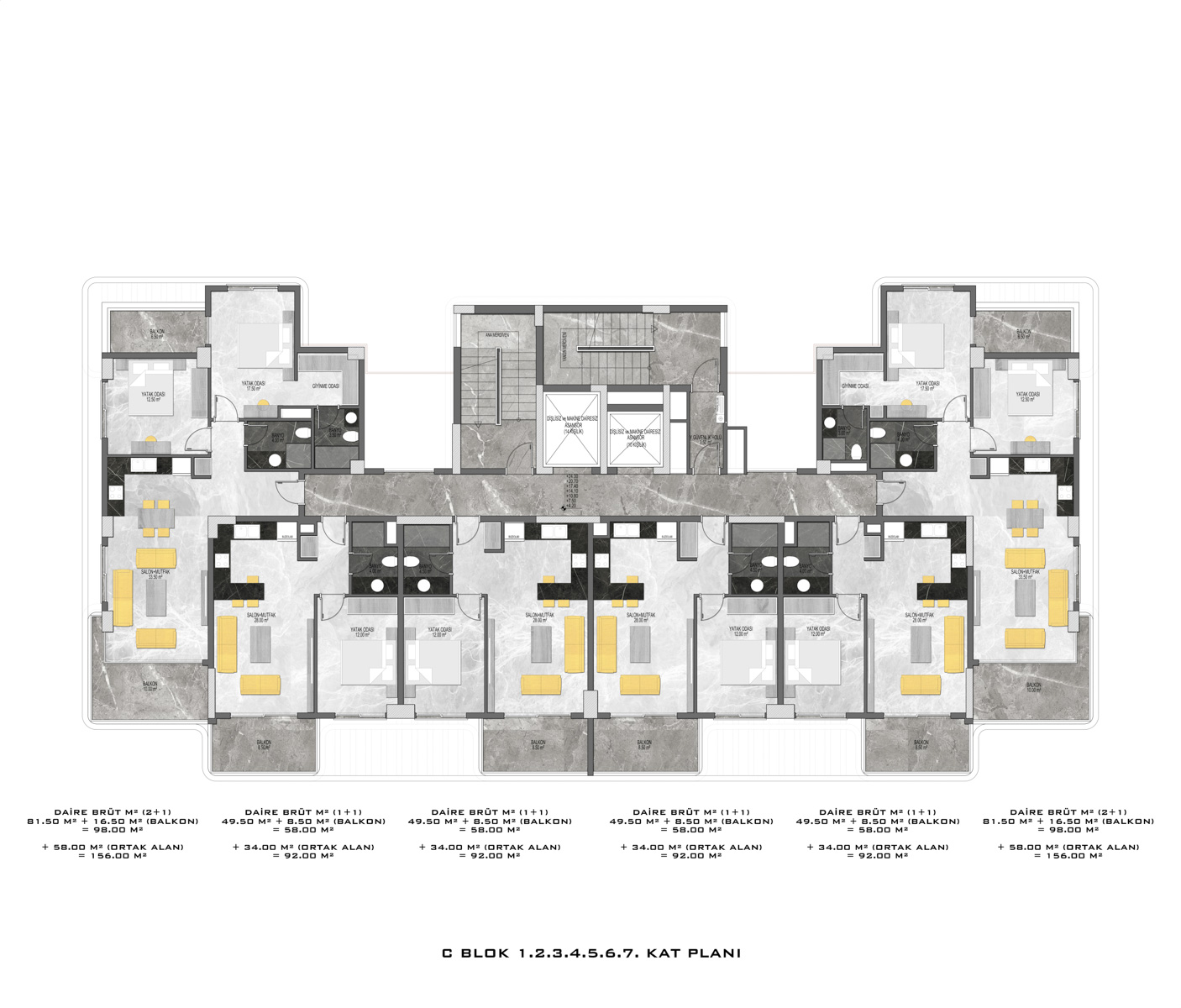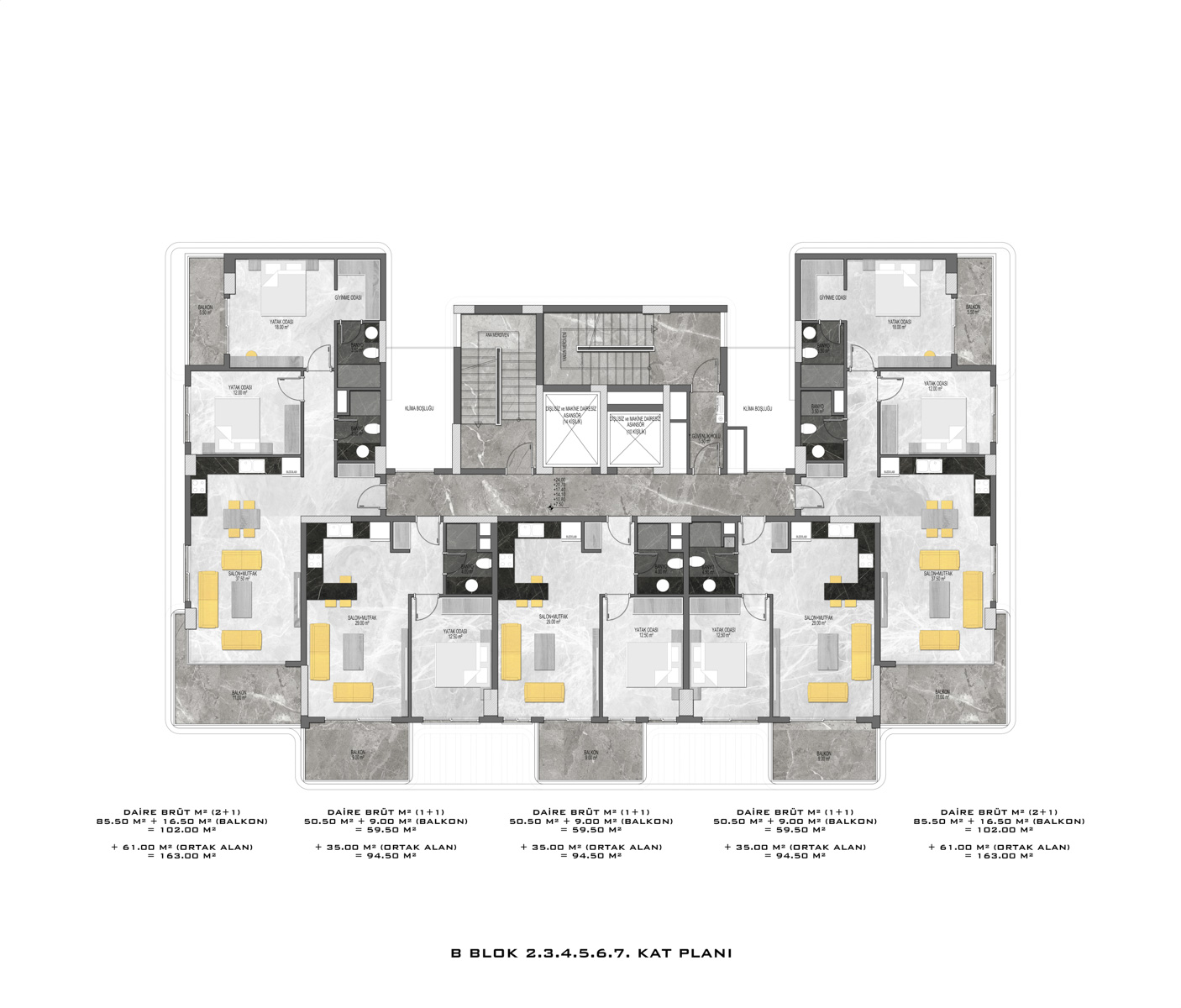 There are a total of 135 flats in 3 blocks in the complex, which was built in accordance with European standards by using first class materials and modern technologies on a 6678 m2 landscaped area.