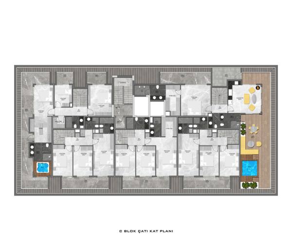 A distinctive feature of the complex is the installation of water purification systems, which will make tap water drinkable in each apartment, and a heating system, which is rare in Alanya.