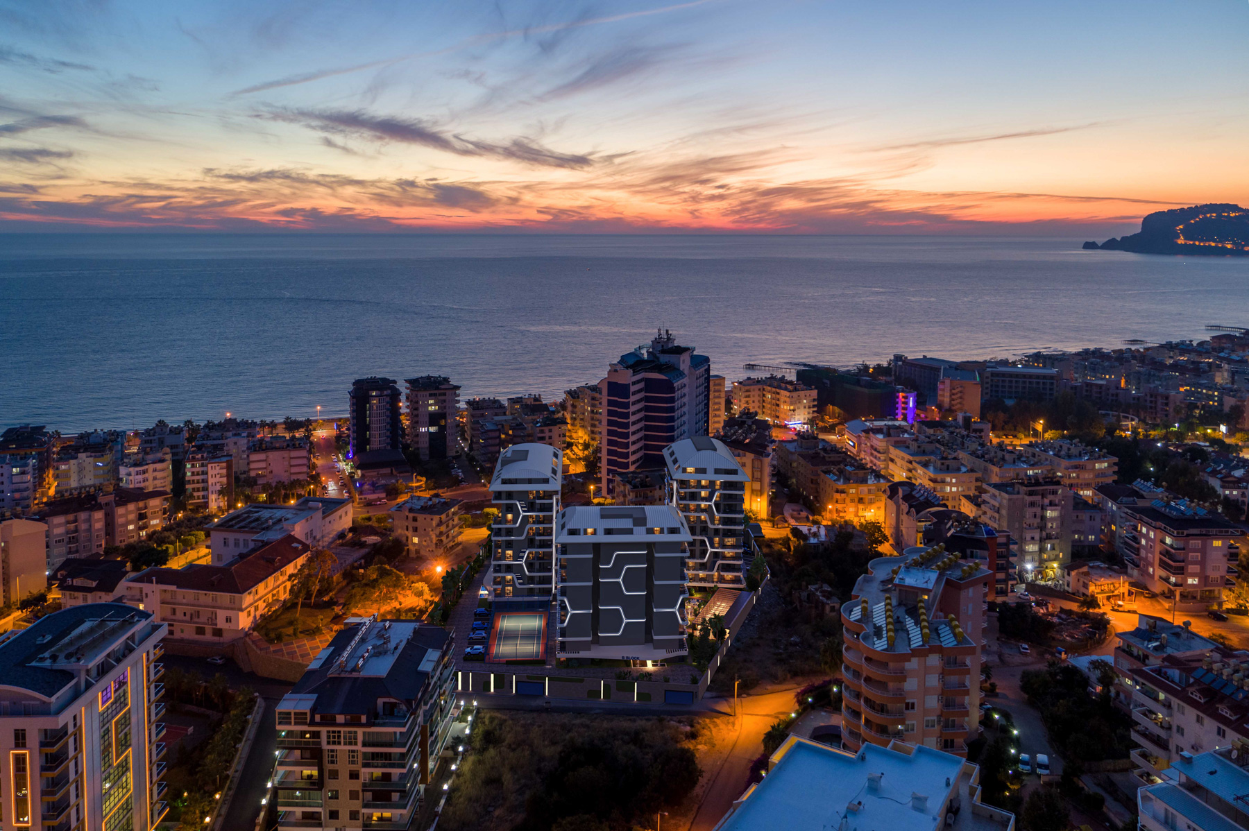 This first-class complex, which meets all the requirements of a luxury real estate, is located only 245 meters from the sea. The residential complex has an original and modern design with the concept of a five-star hotel. There are many facilities such as a pool and spa area, playgrounds, parking lots, cinema, tennis court etc.