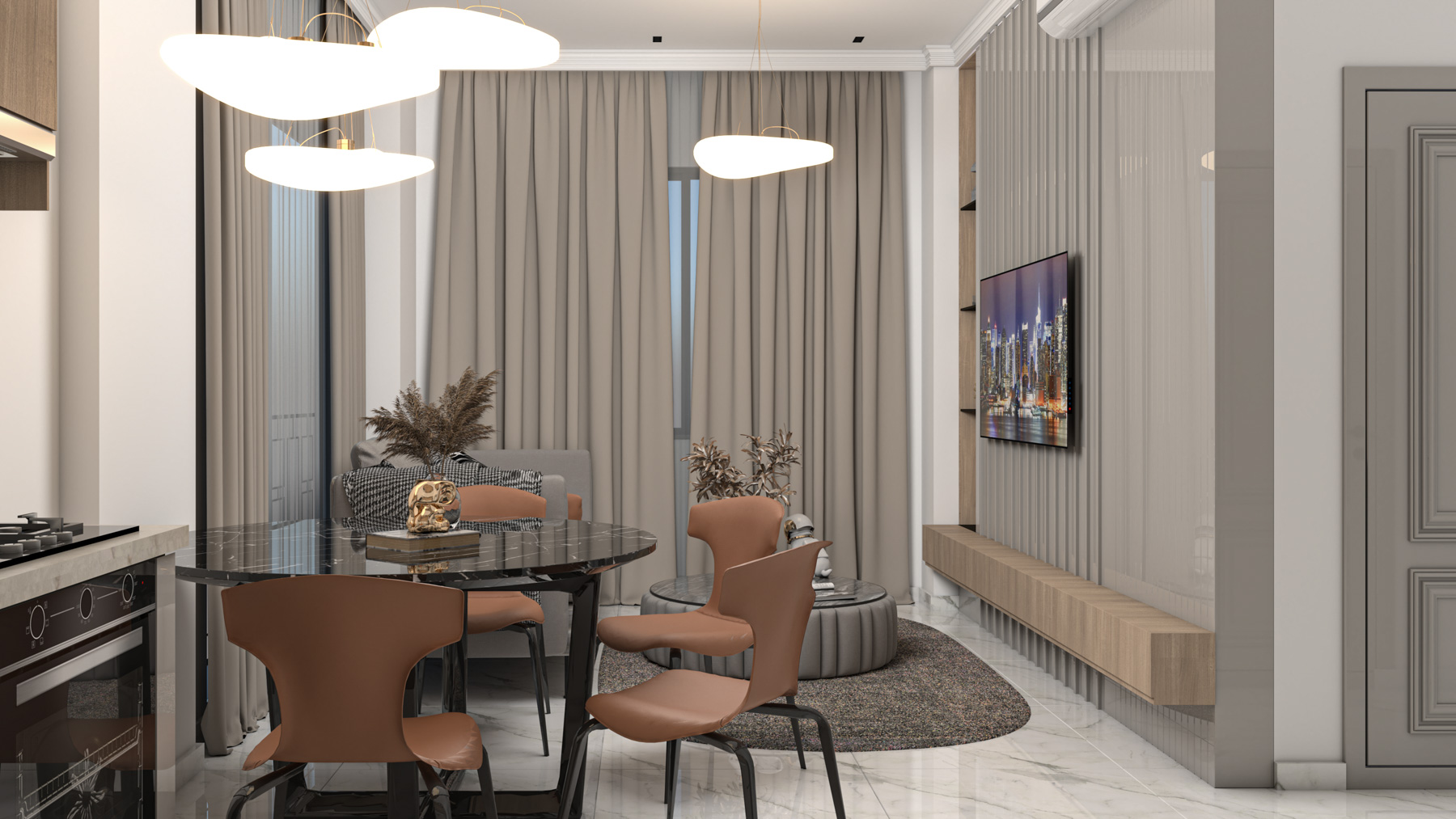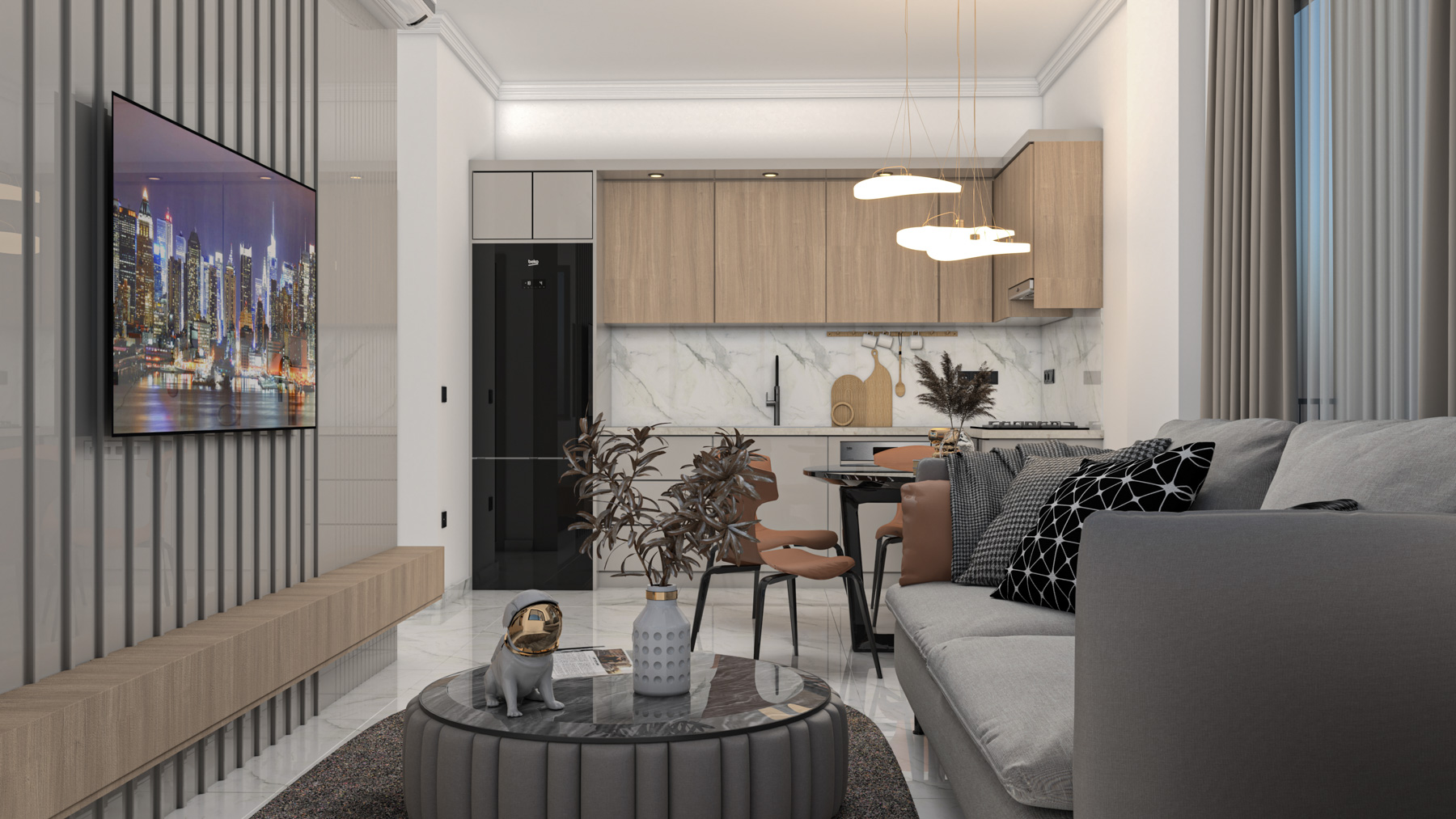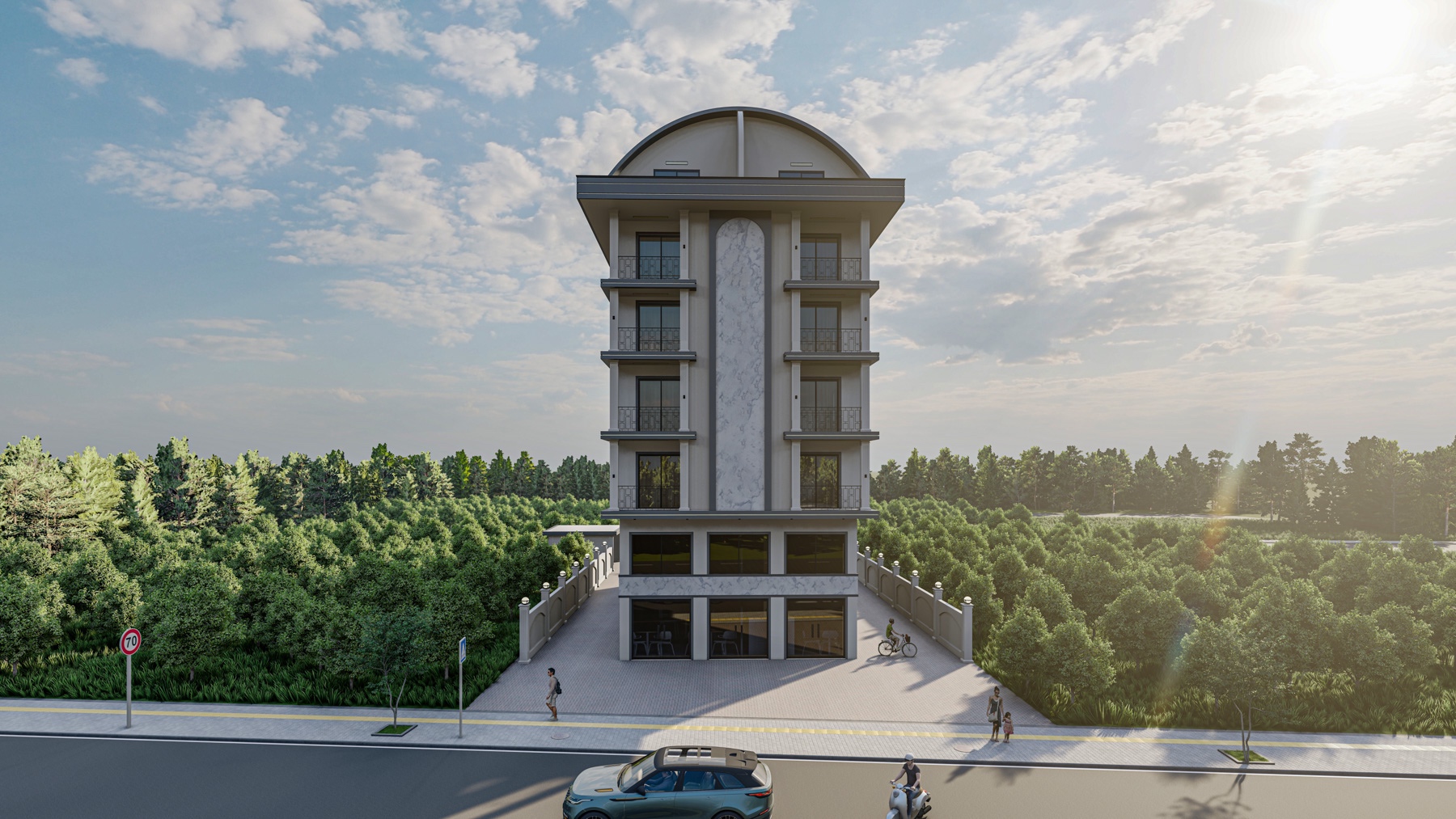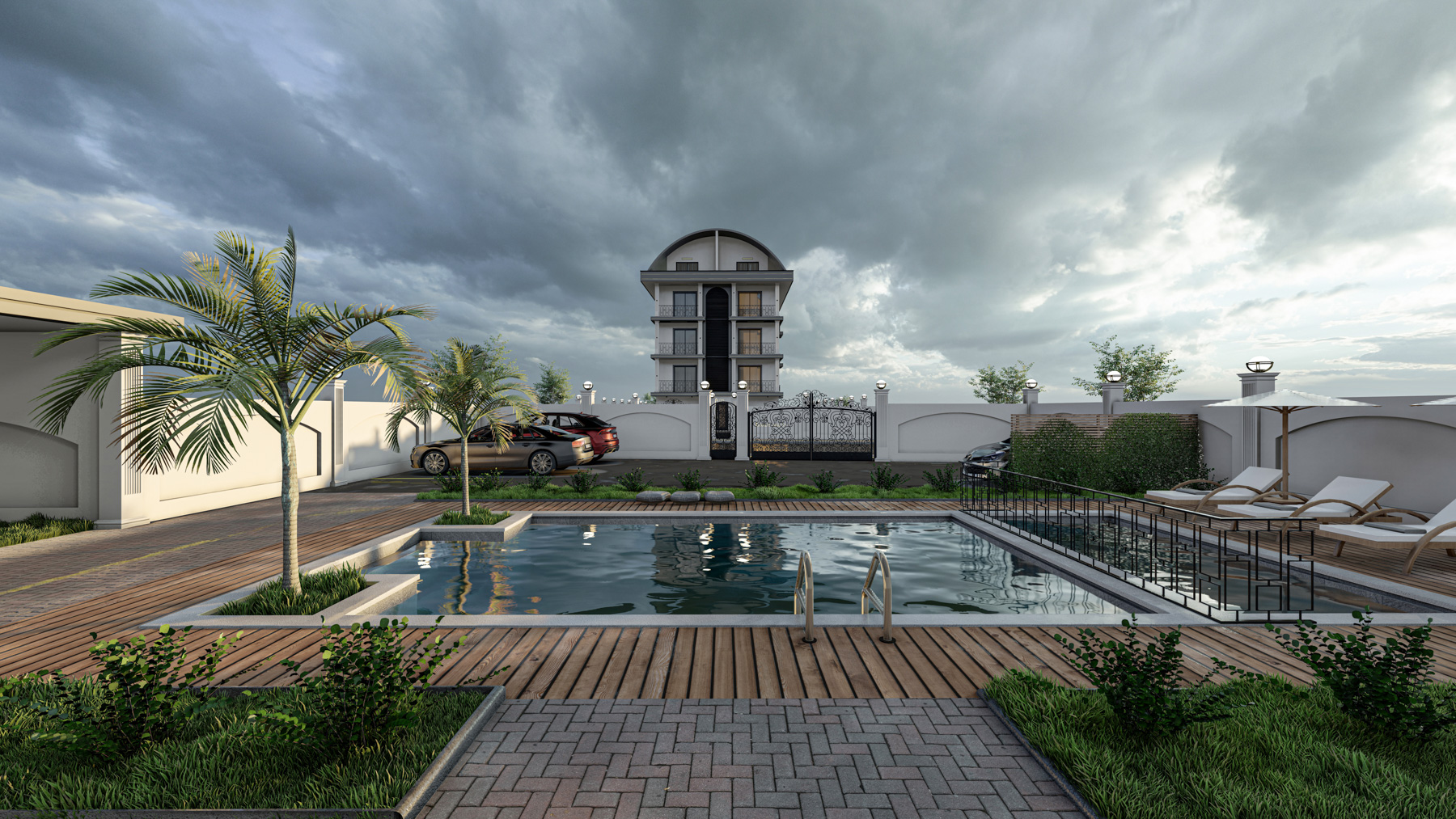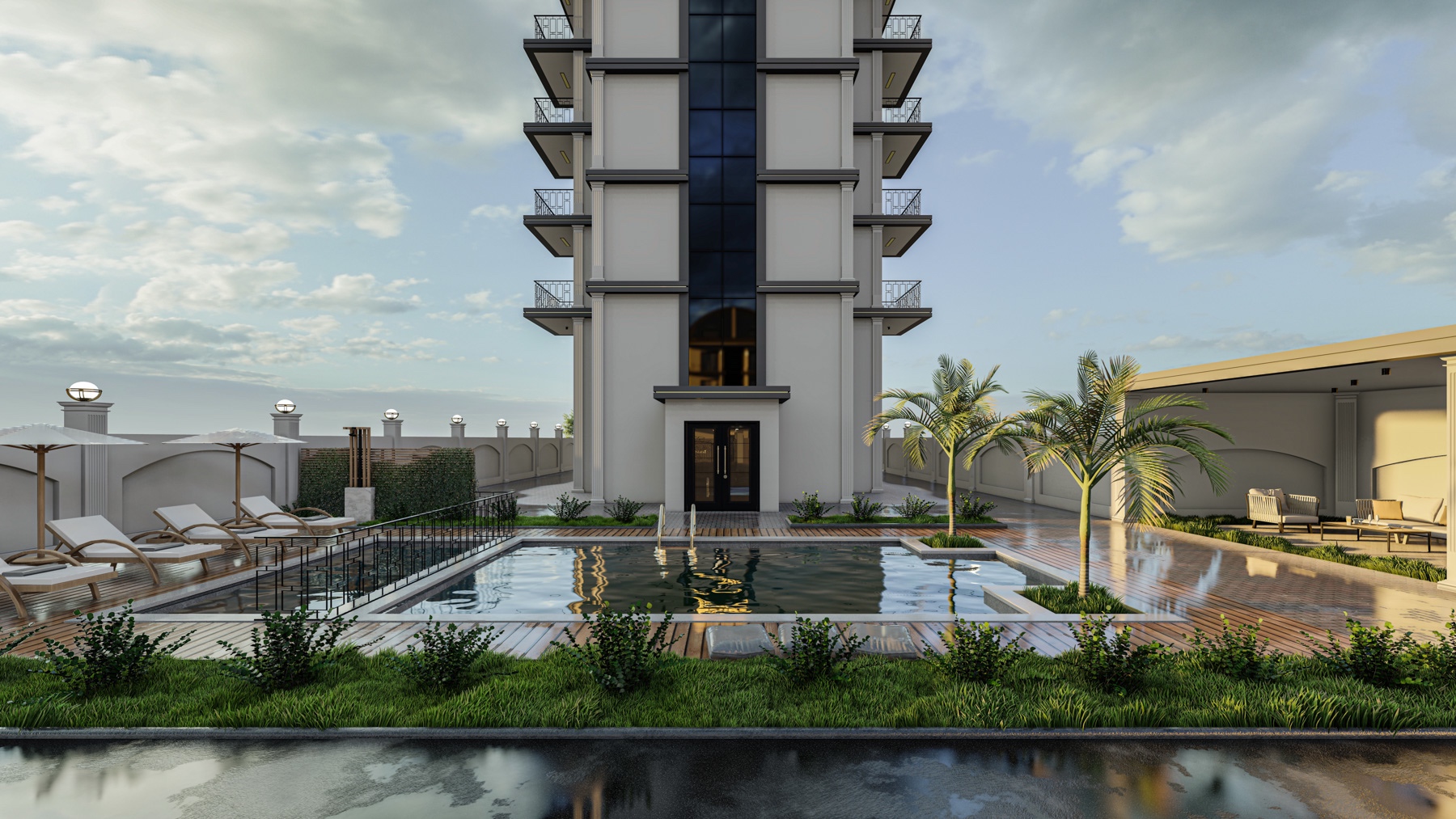 The complex has a swimming pool, children's pool and open parking lot. For those who prefer small complexes equipped with comfortable facilities, this boutique complex is a suitable option. High quality materials are used in the construction. All apartments will be delivered with built-in kitchens and bathrooms equipped with plumbing and cabinets.