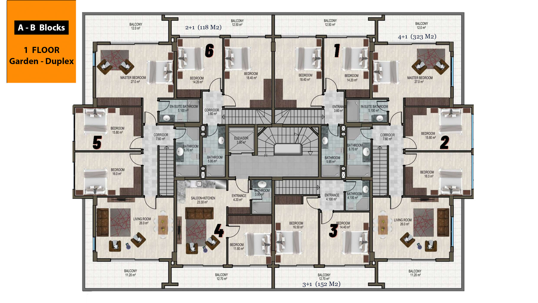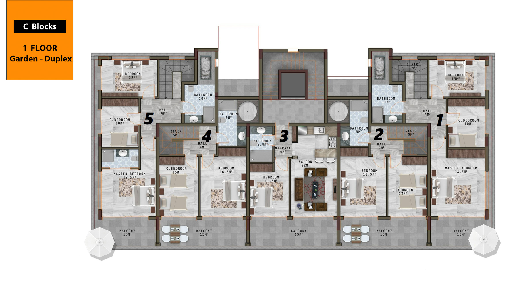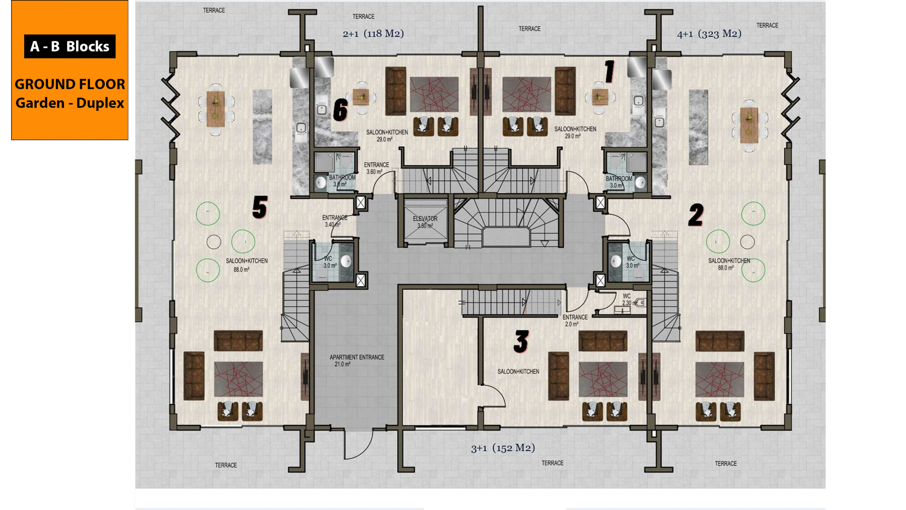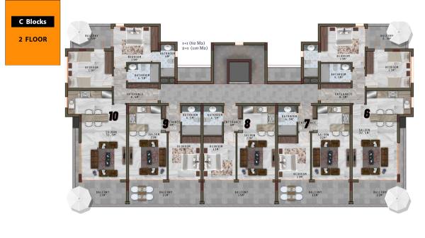 The complex which is only 800 meters to the sea is located on an area of 6500 square meters and consists of 3 five-storey blocks with a total of 66 apartments. There are 1+1, 3+1, 2+1 garden duplex, 3+1 garden duplex, 4+1 garden duplex, 2+1 penthouse, 3+1 penthouse, 4+1 penthouse apartments. 3+1 and 4+1 penthouses have private pools.