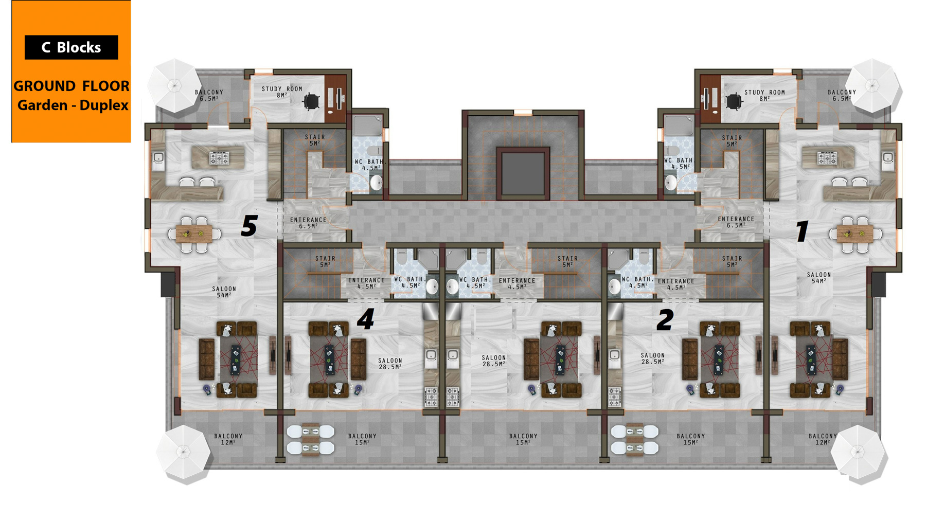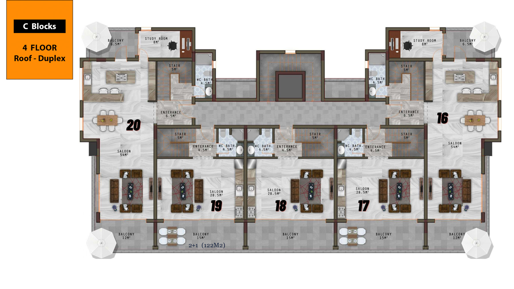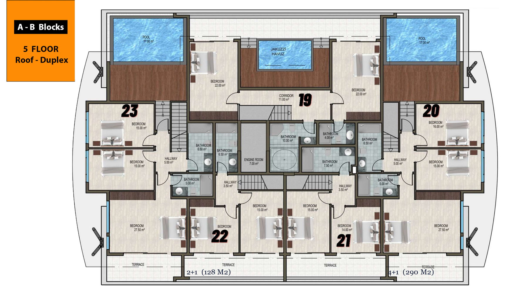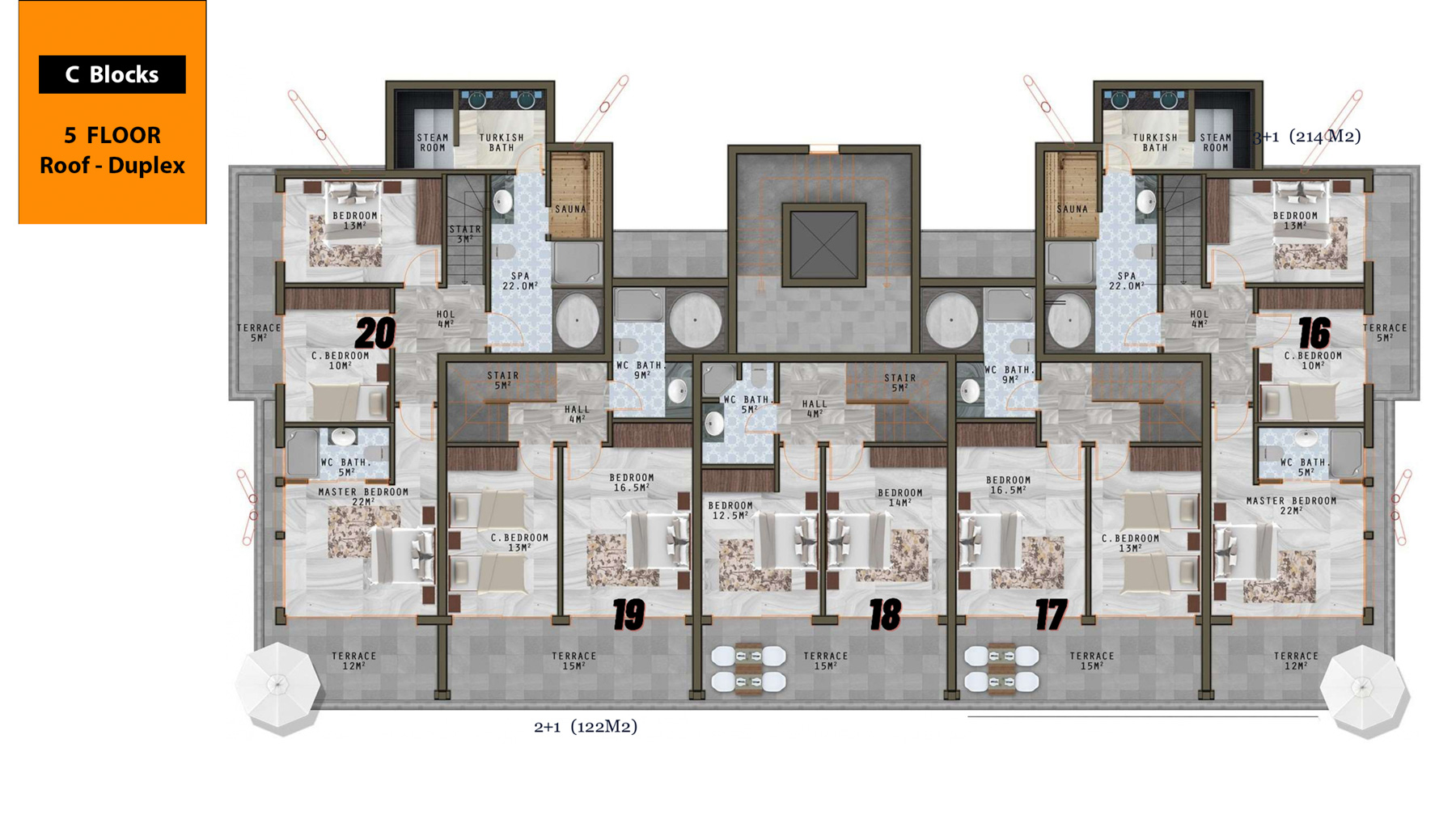The complex which is only 800 meters to the sea is located on an area of 6500 square meters and consists of 3 five-storey blocks with a total of 66 apartments. There are 1+1, 3+1, 2+1 garden duplex, 3+1 garden duplex, 4+1 garden duplex, 2+1 penthouse, 3+1 penthouse, 4+1 penthouse apartments. 3+1 and 4+1 penthouses have private pools.