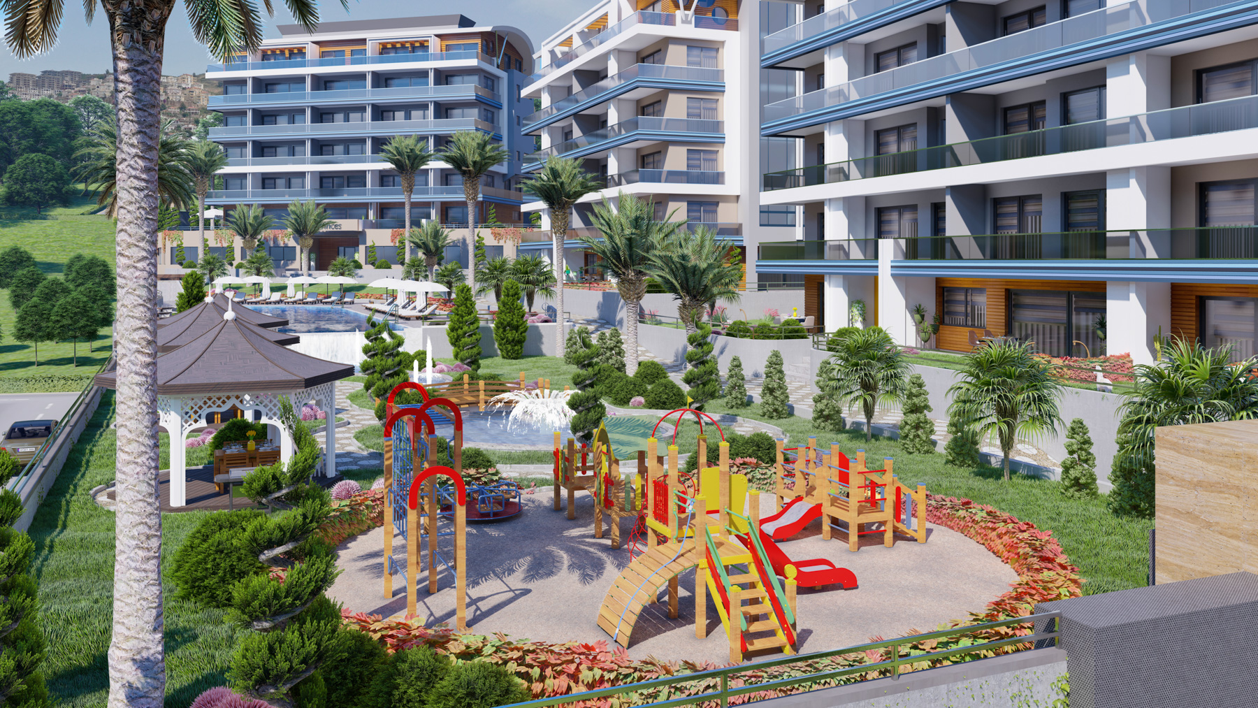 The facilities in the common area of the complex allows residents to spend time comfortably and relax even without leaving the complex. In the well-kept green area there are outdoor and indoor swimming pools, waterfall, children's playground, children's playroom, sauna, Roman steam room, Turkish bath, cinema, conference hall, fitness, restaurant and cafe. There is an indoor and outdoor parking lot.