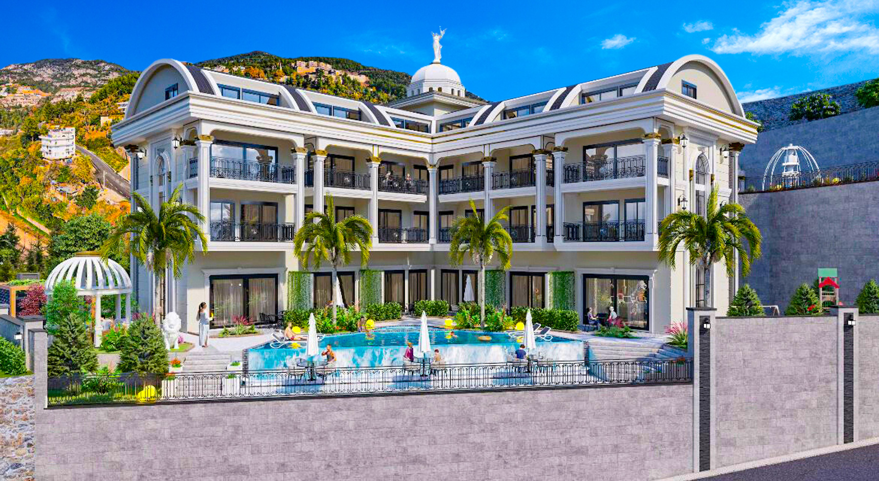New luxury residential complex in the prestigious neighborhood of Alanya, Bektaş. The apartments are eligible for Turkish citizenship.