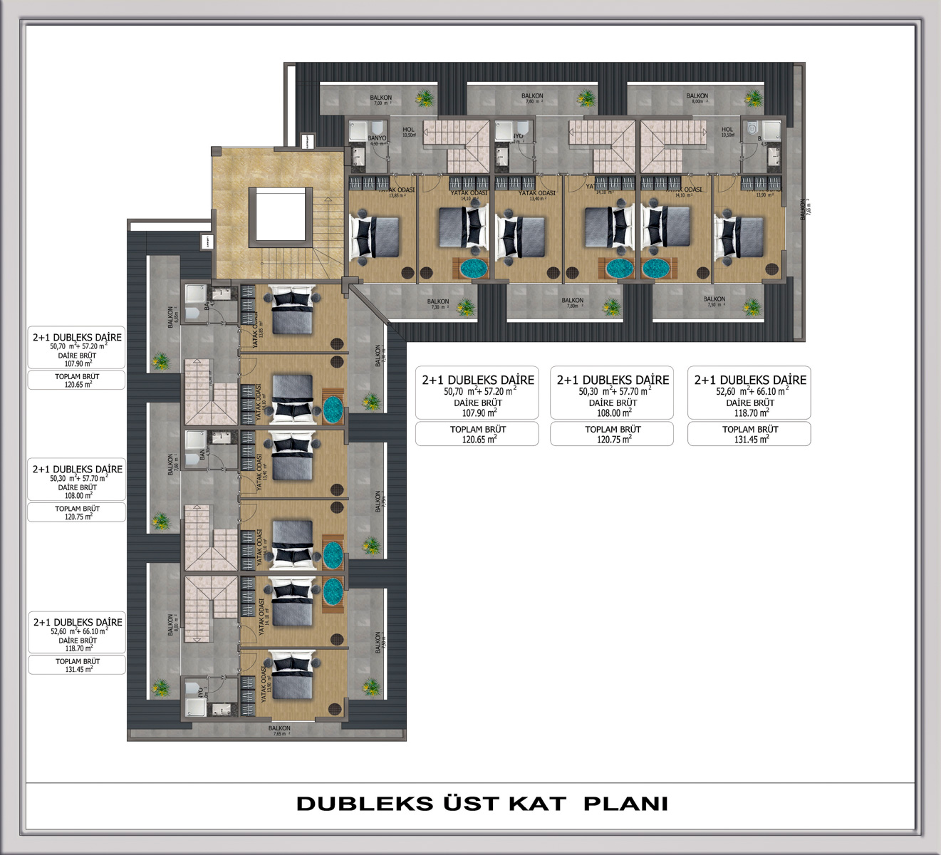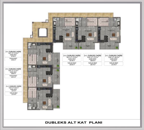 The complex has only 12 apartments, 6 garden duplexes and 6 penthouses. All apartments are between 120-131 m2 with a 2+1 layout consisting of two bedrooms and a living room with an open kitchen.