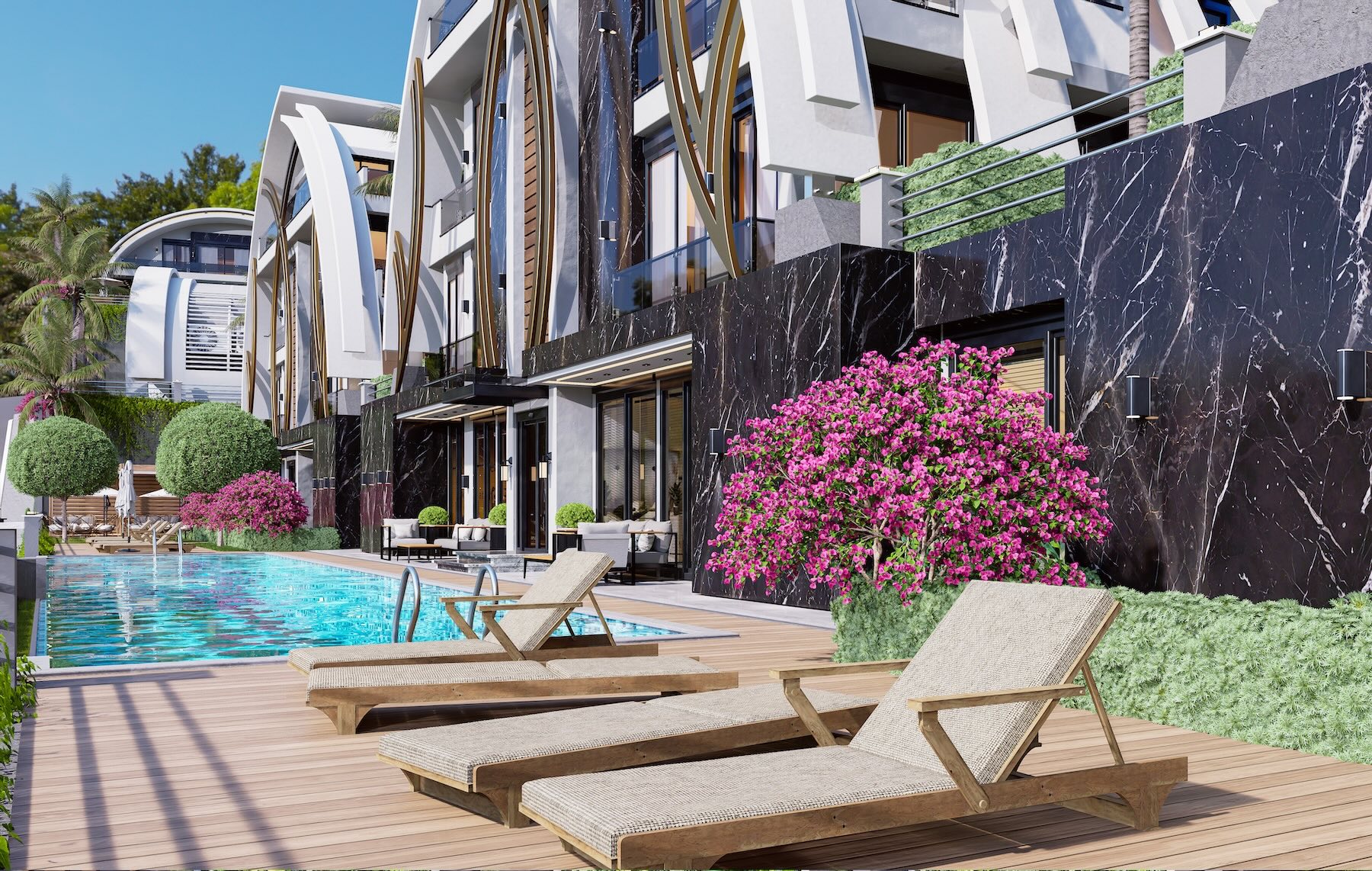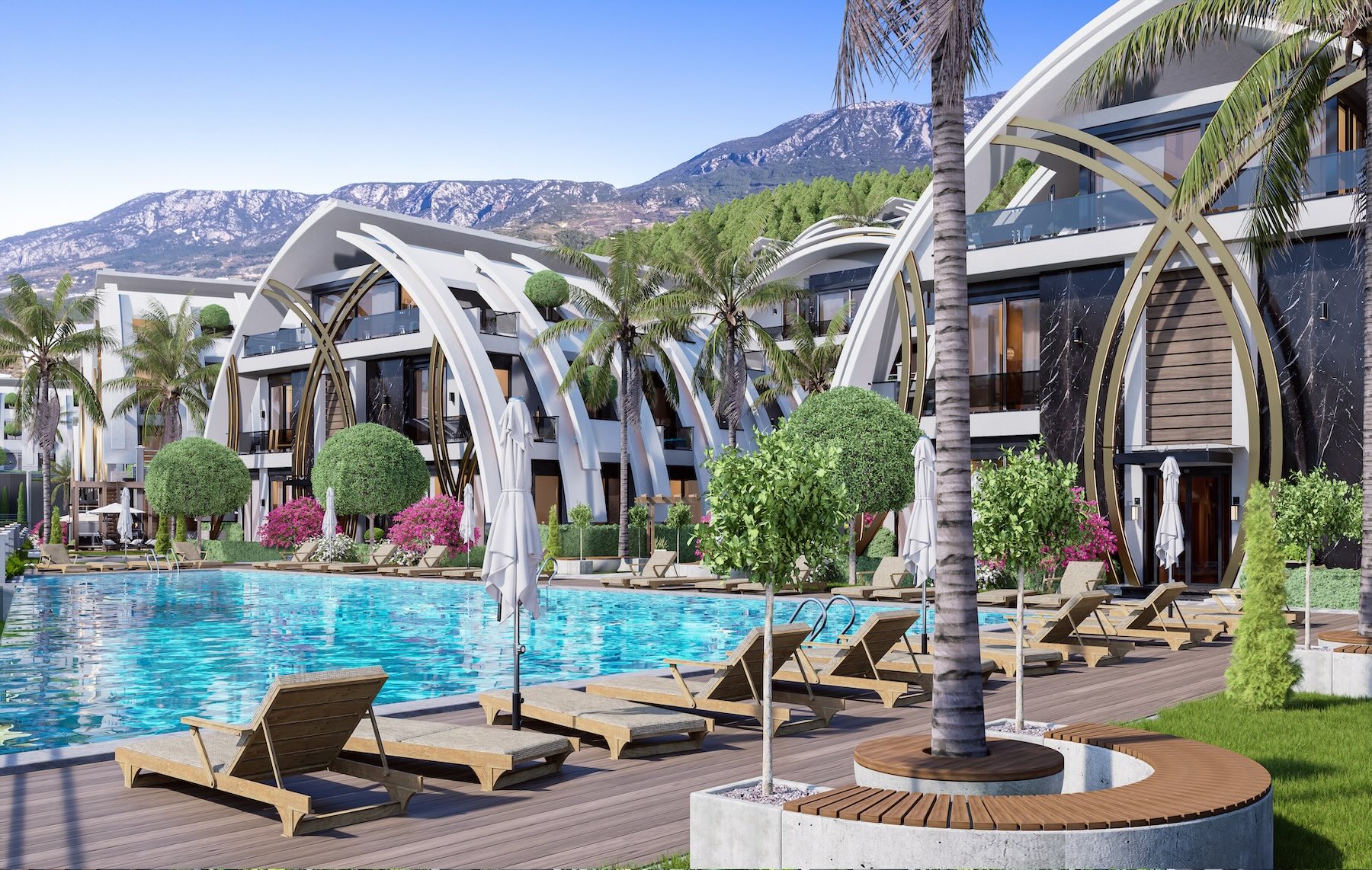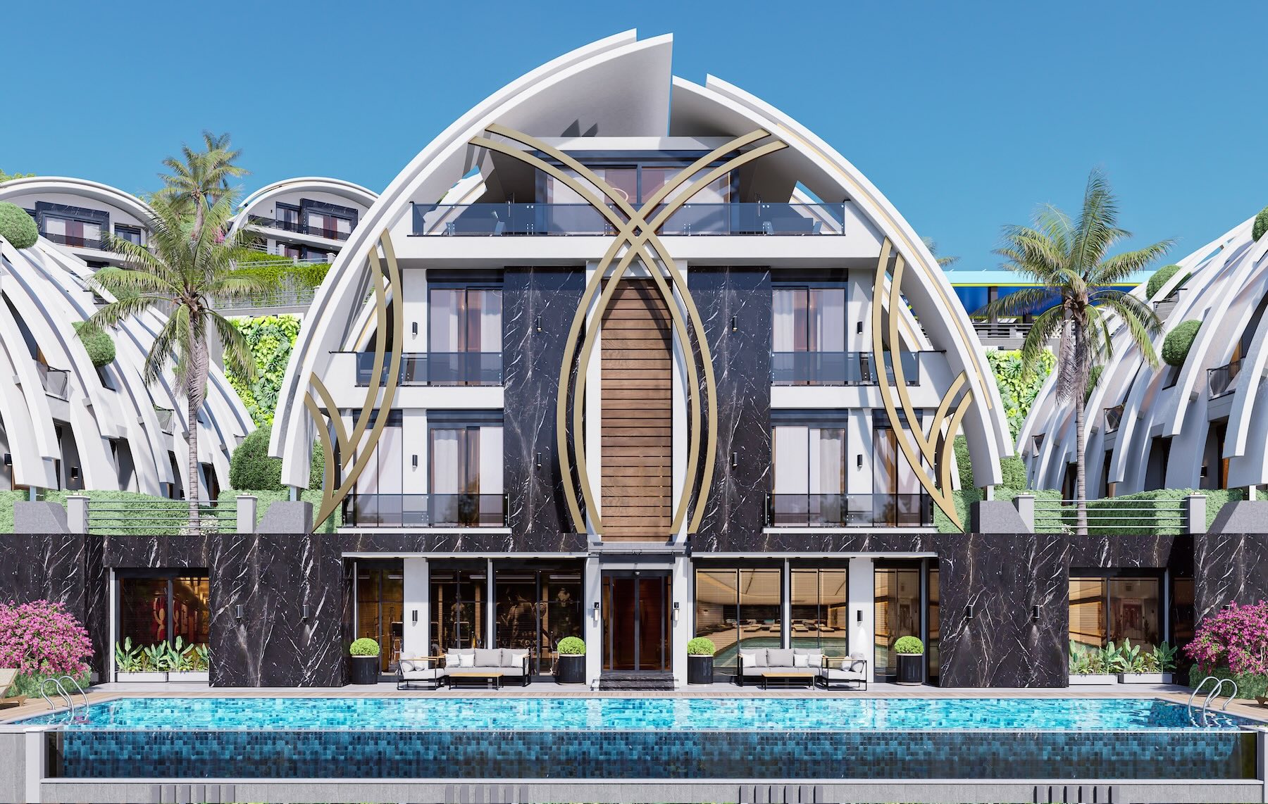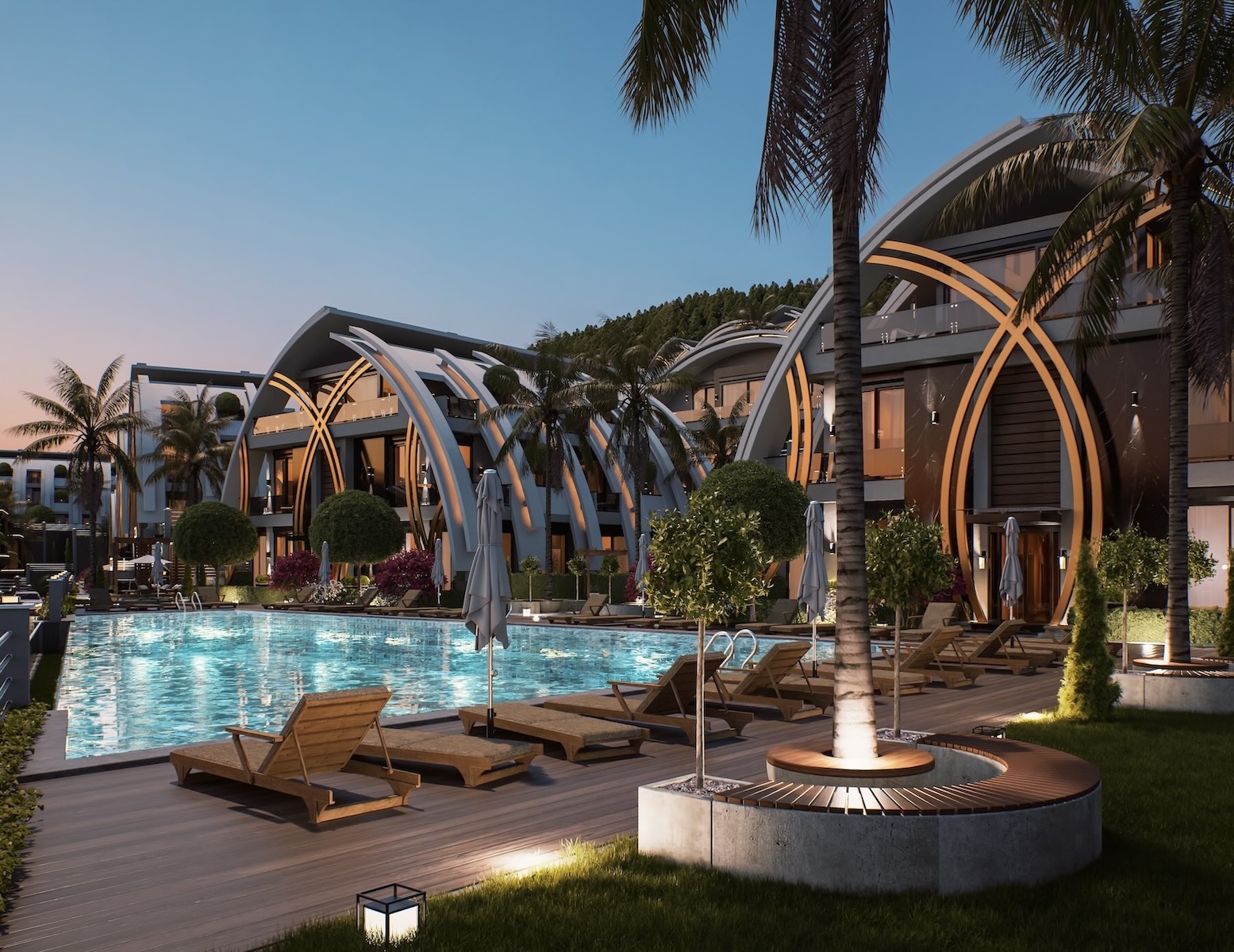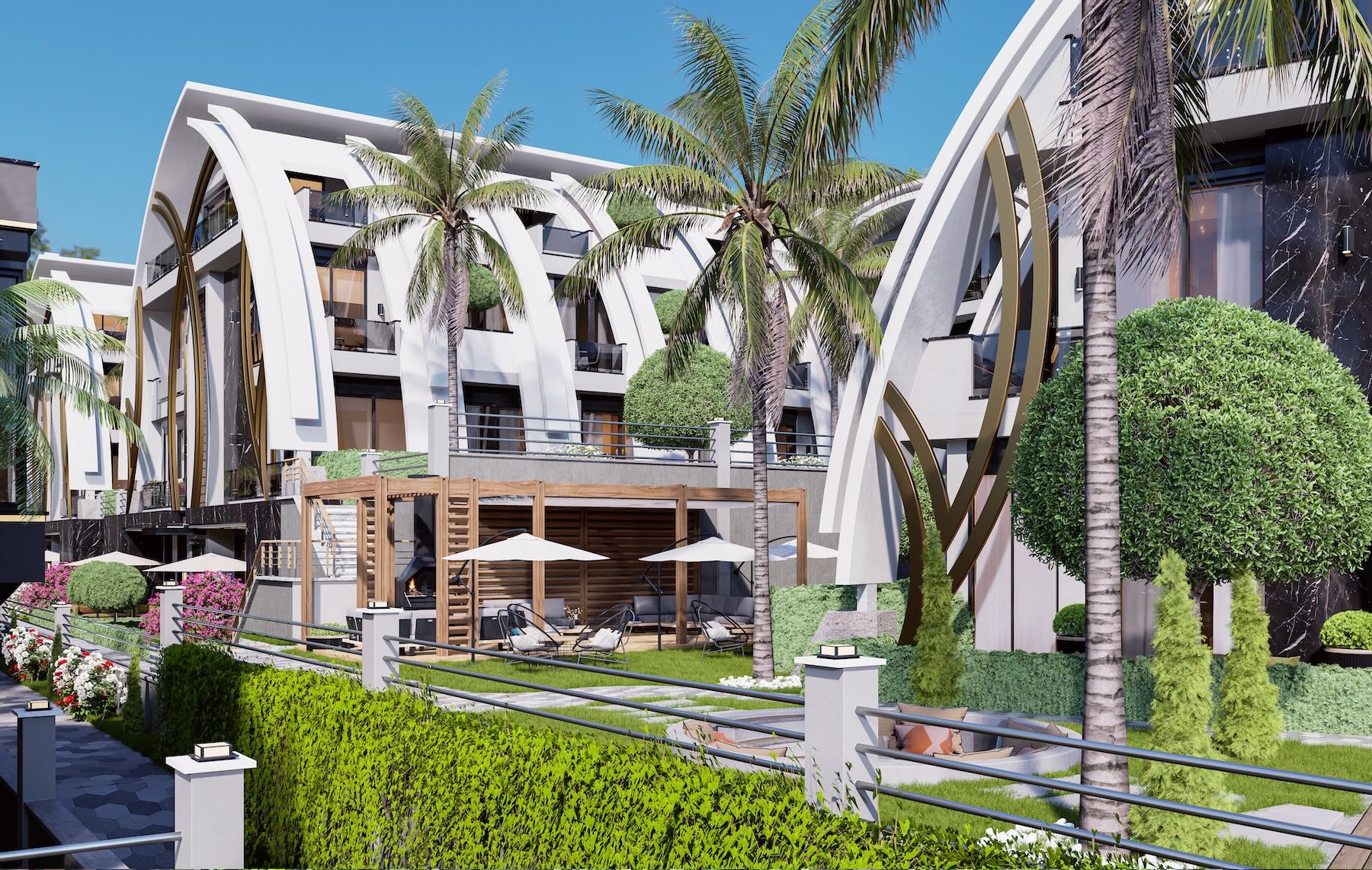 The residential complex consists of 42 villas of 3+1 layout with private pools and garages (heated floors) on an area of 32,000 square meters, as well as 124 apartments in 14 blocks with 1+1, 2+1 with garden access and 3+1 penthouses.