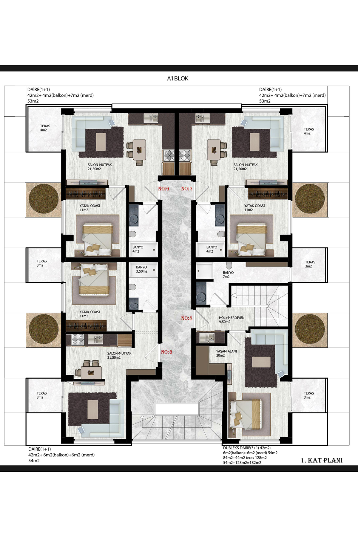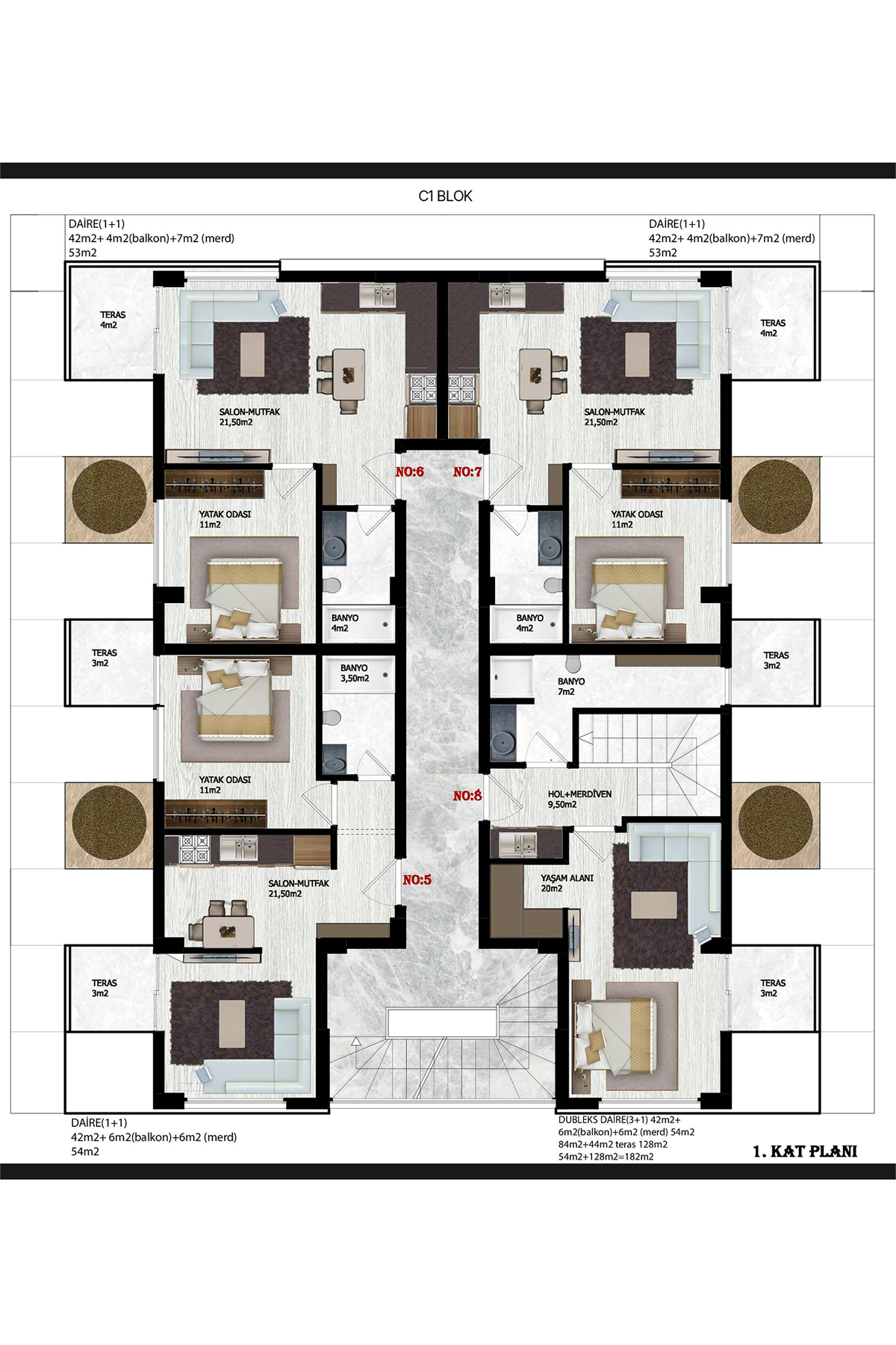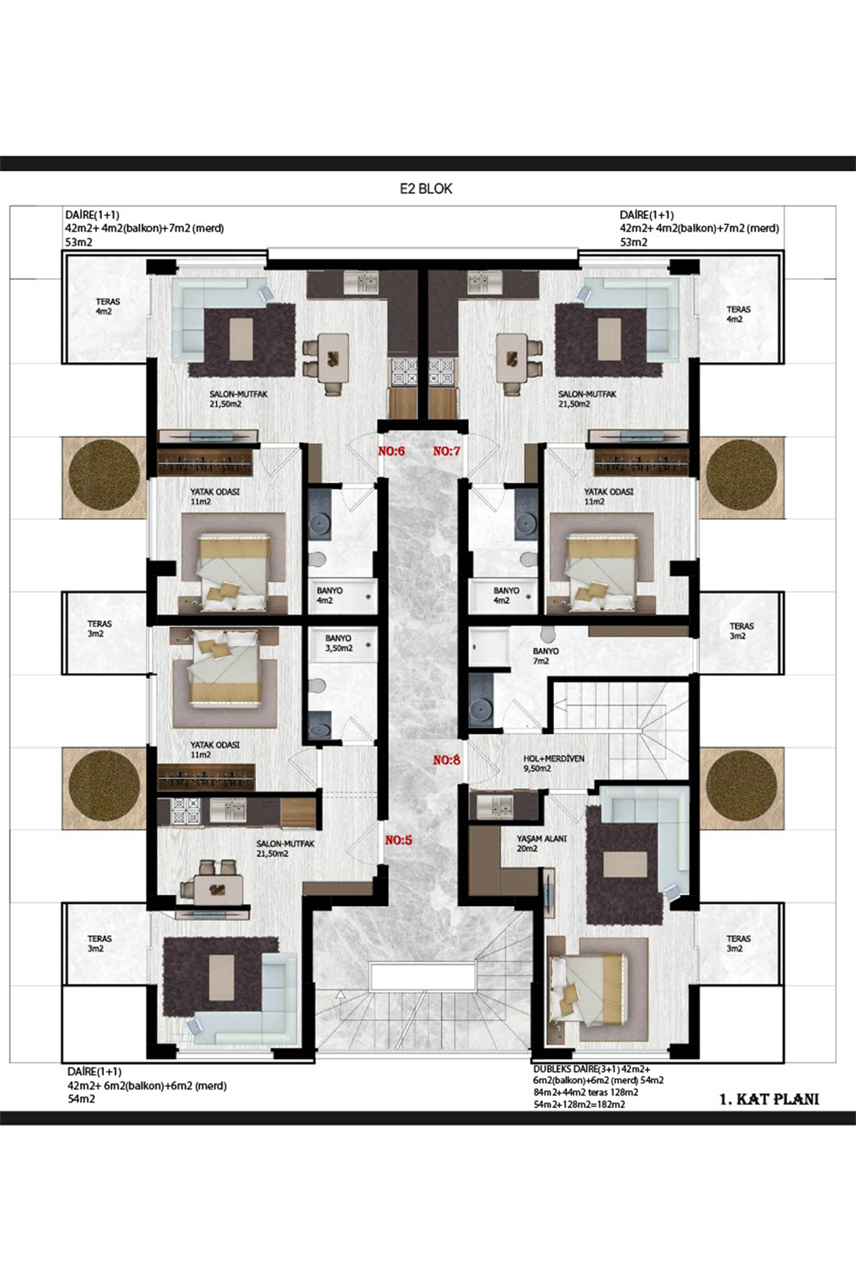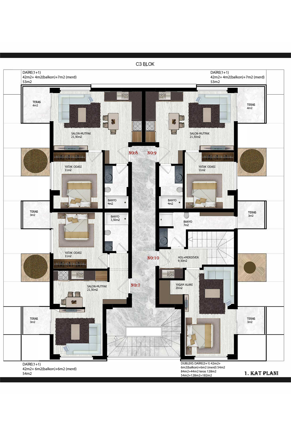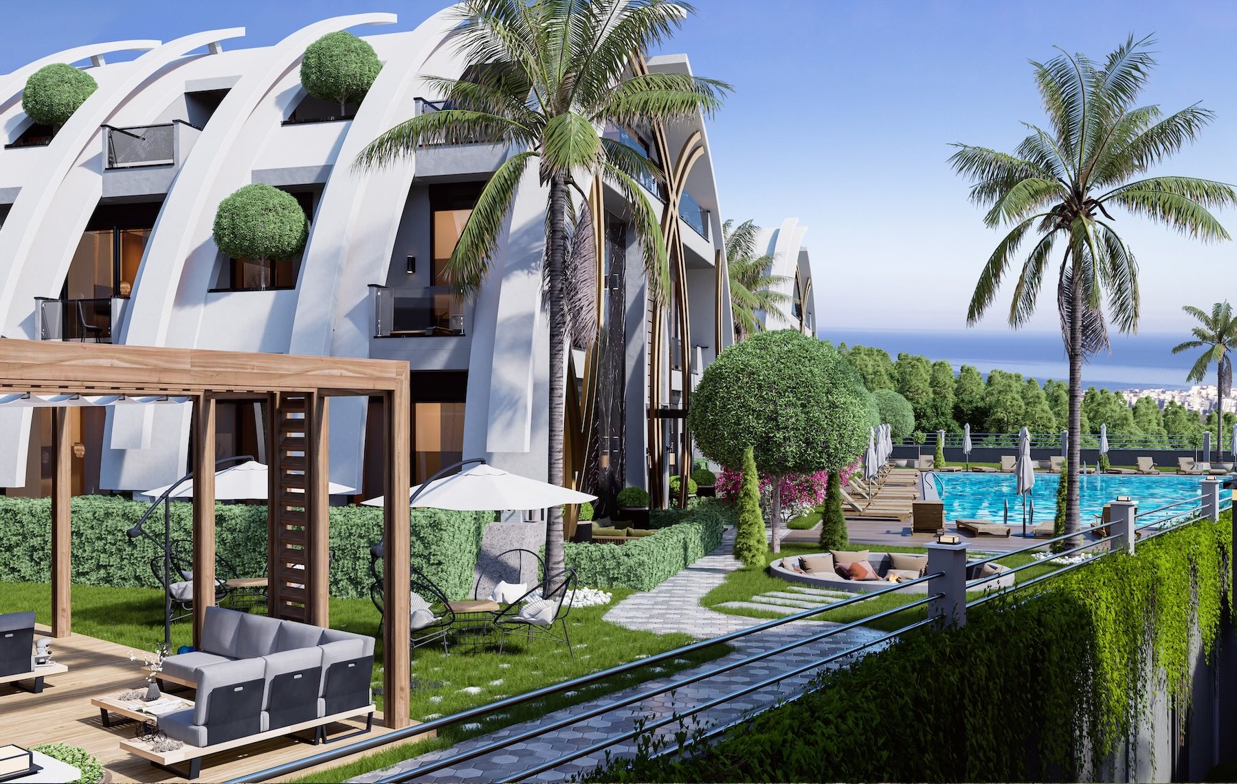 The residential complex consists of 42 villas of 3+1 layout with private pools and garages (heated floors) on an area of 32,000 square meters, as well as 124 apartments in 14 blocks with 1+1, 2+1 with garden access and 3+1 penthouses.