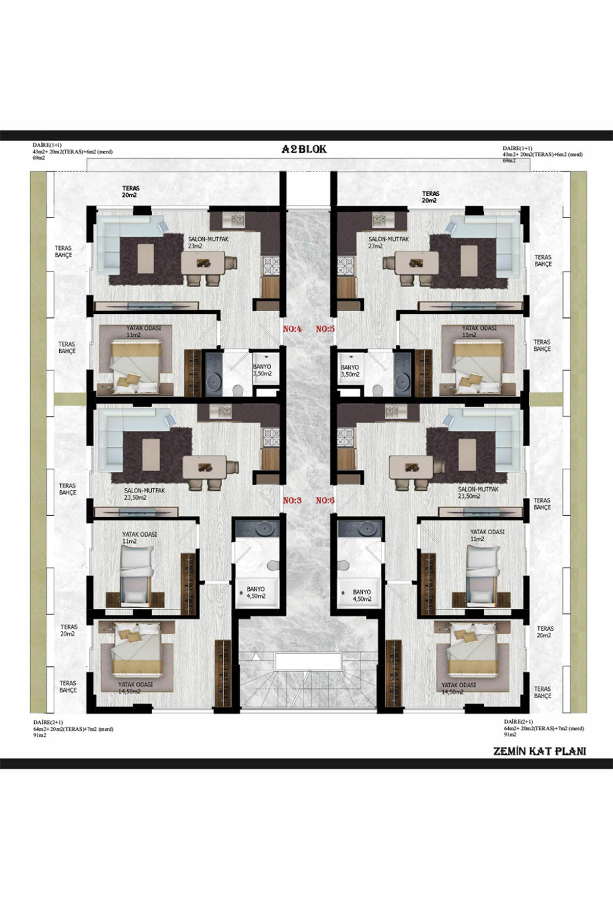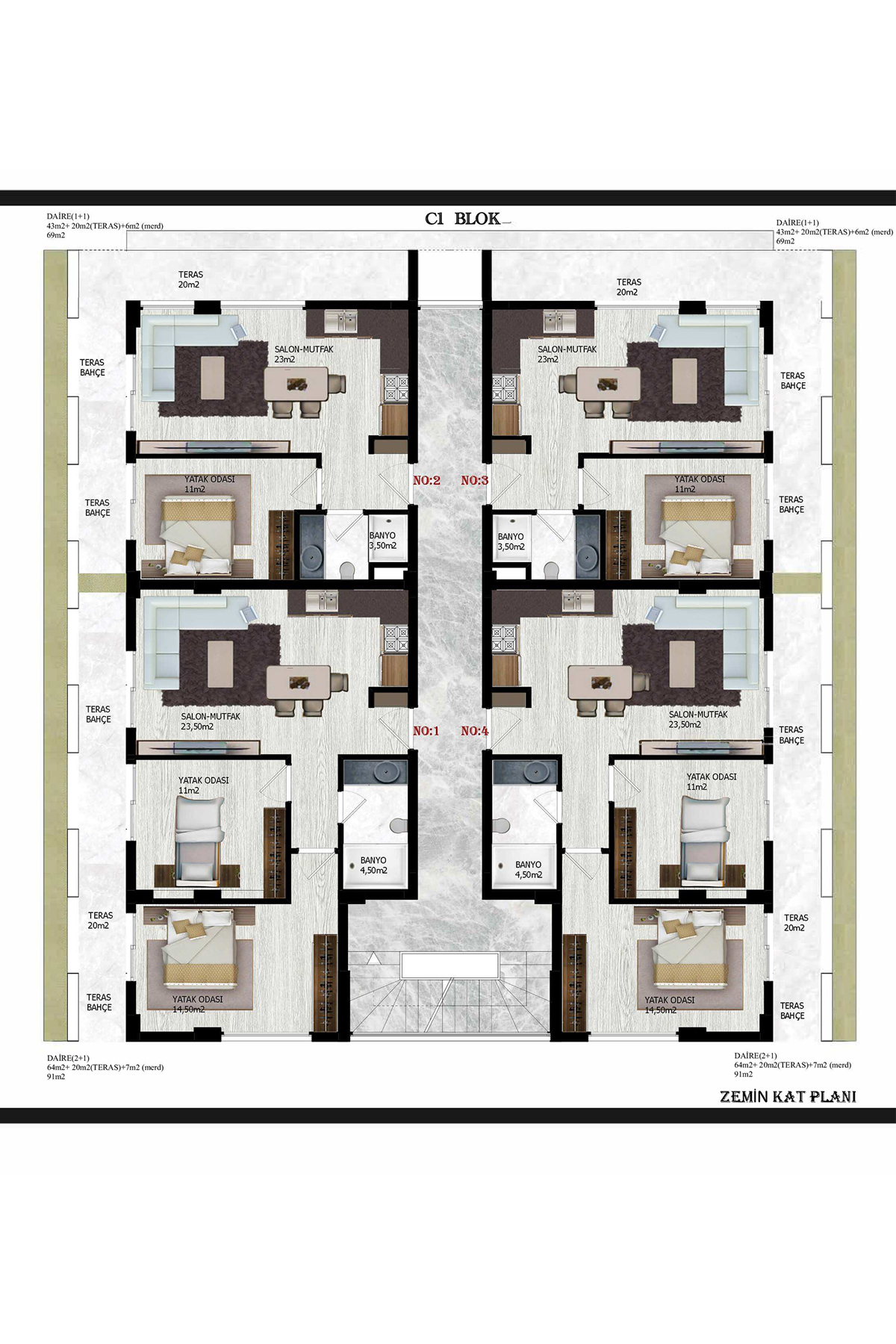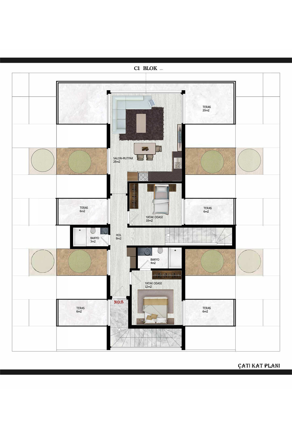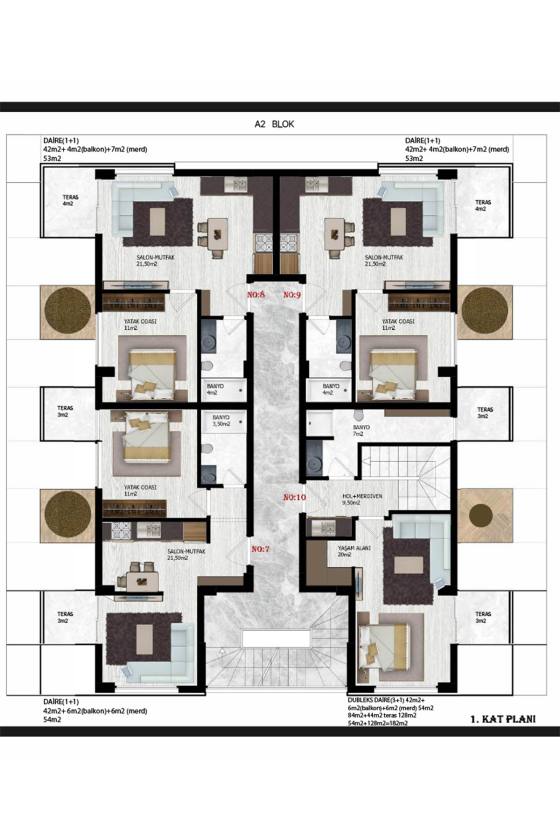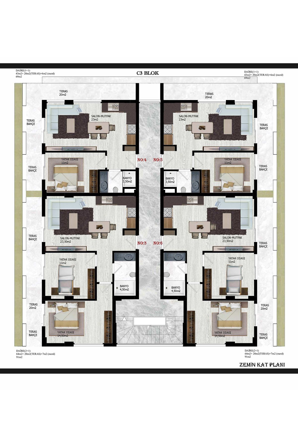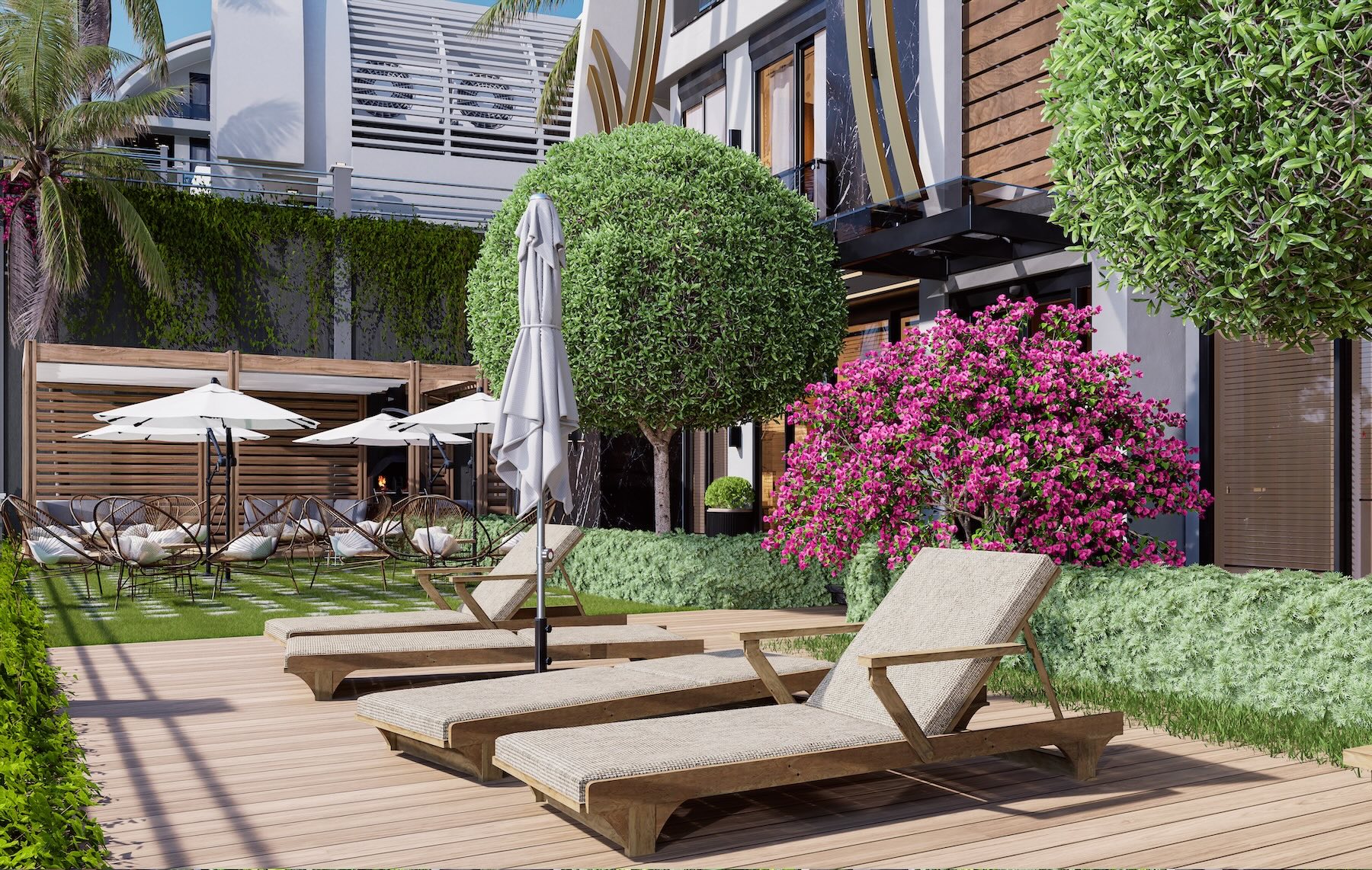 The residential complex consists of 42 villas of 3+1 layout with private pools and garages (heated floors) on an area of 32,000 square meters, as well as 124 apartments in 14 blocks with 1+1, 2+1 with garden access and 3+1 penthouses.