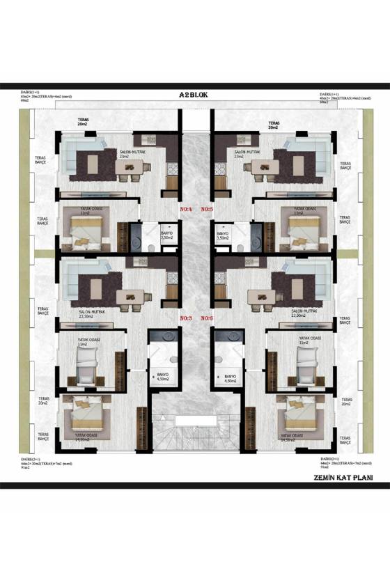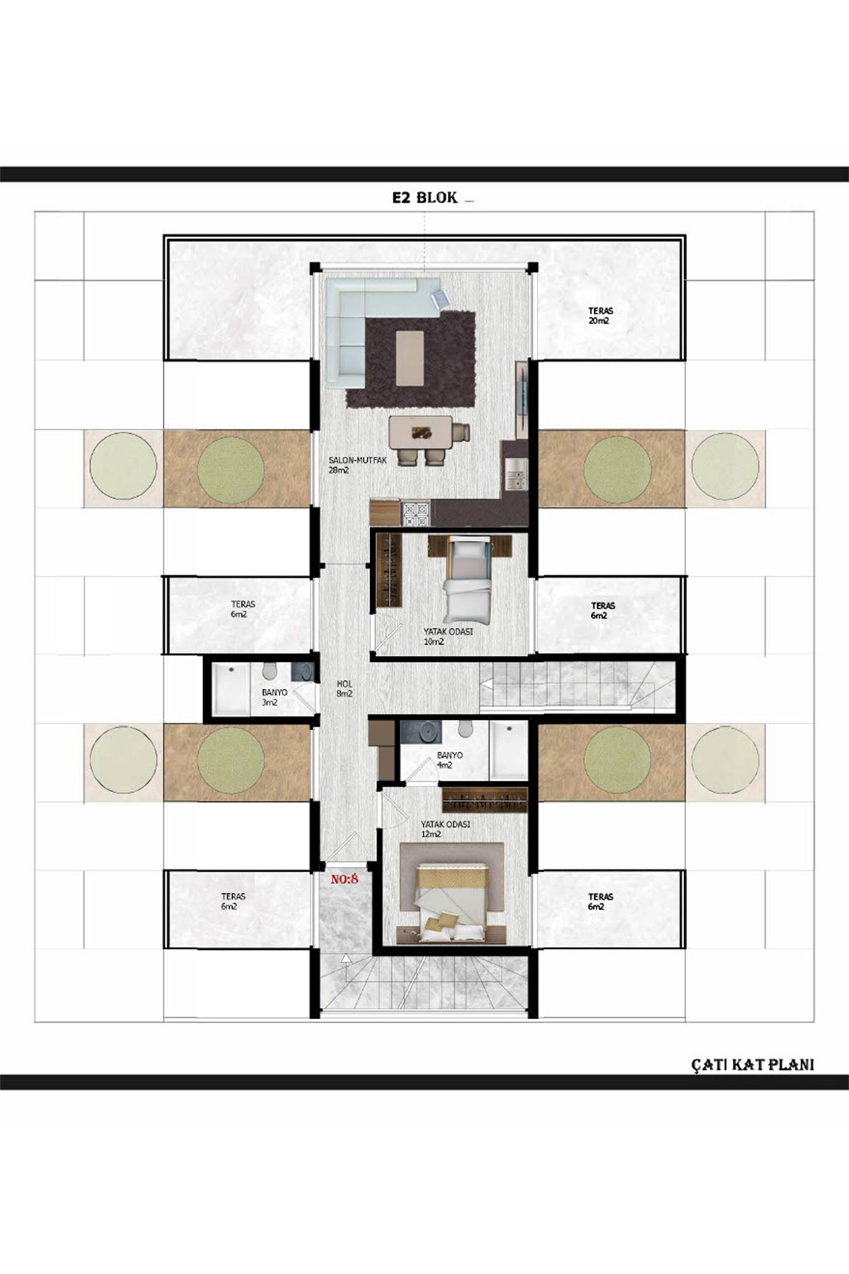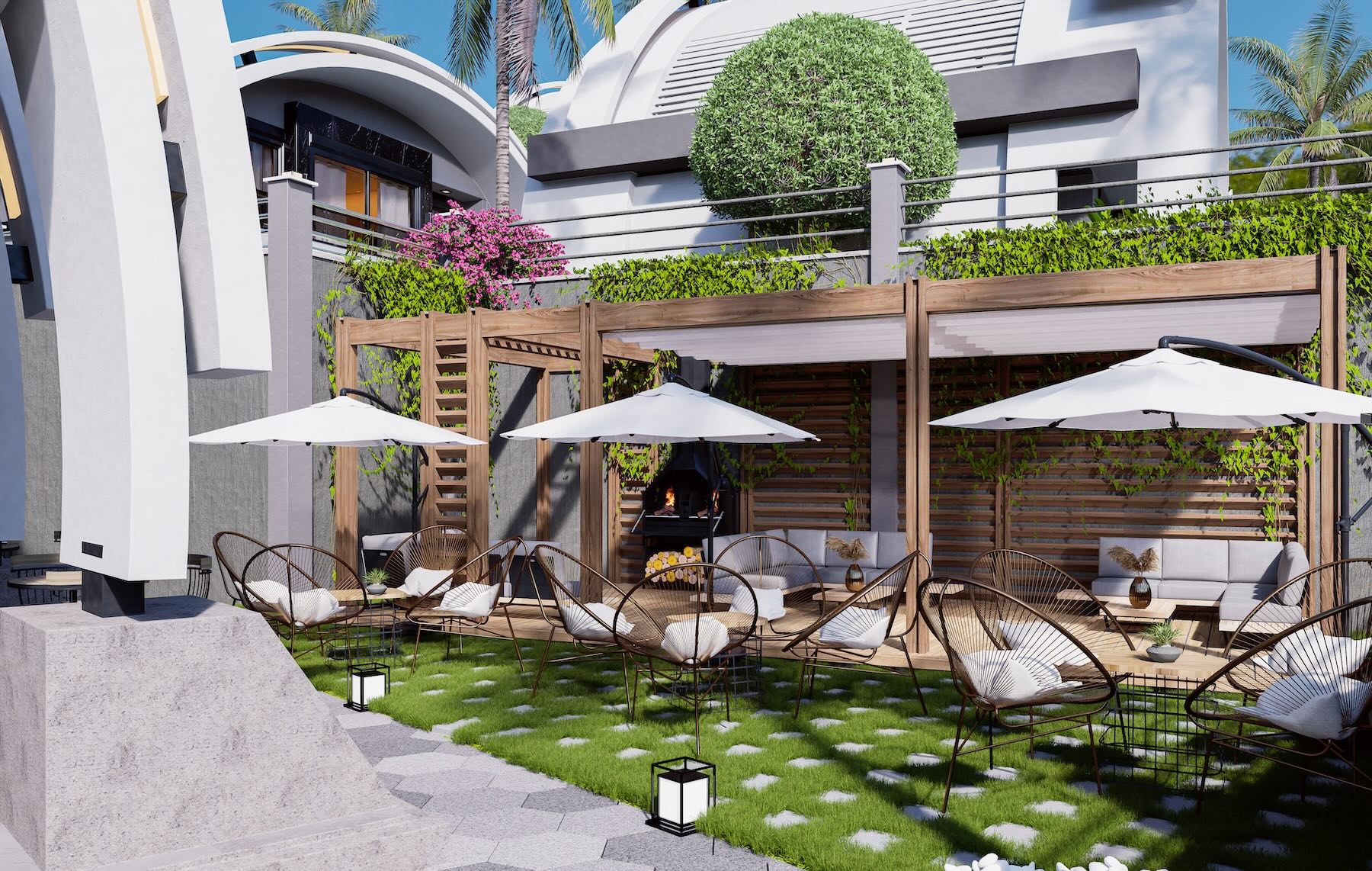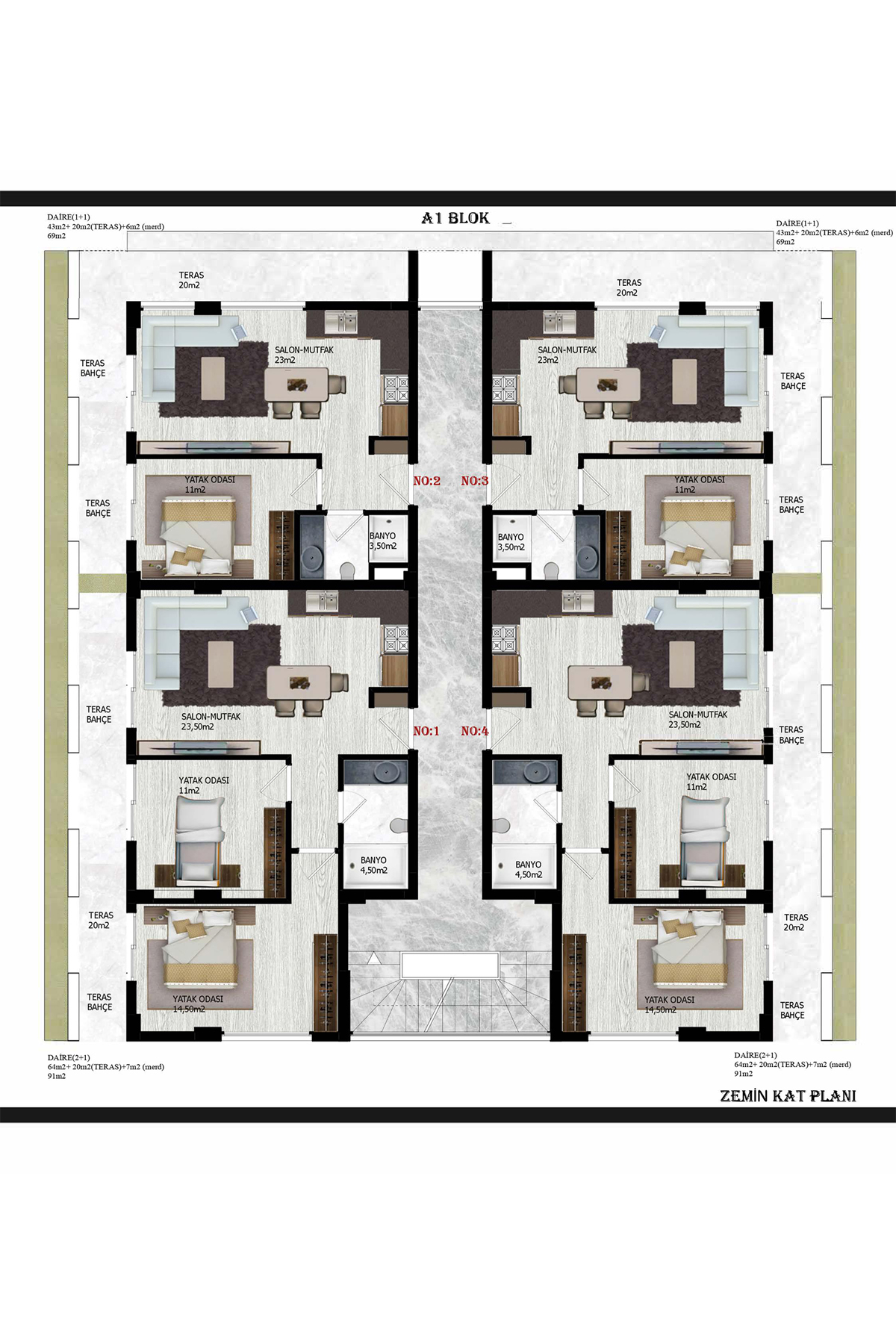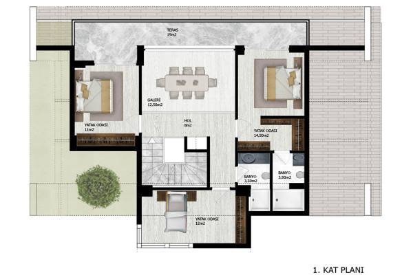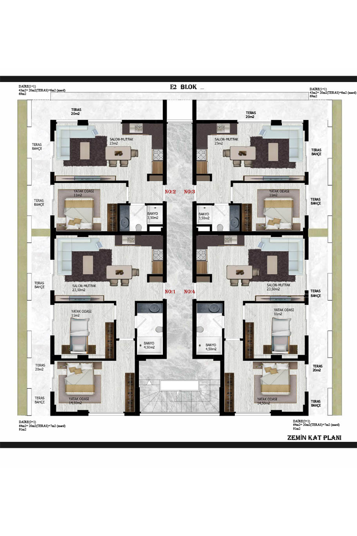The residential complex consists of 42 villas of 3+1 layout with private pools and garages (heated floors) on an area of 32,000 square meters, as well as 124 apartments in 14 blocks with 1+1, 2+1 with garden access and 3+1 penthouses.