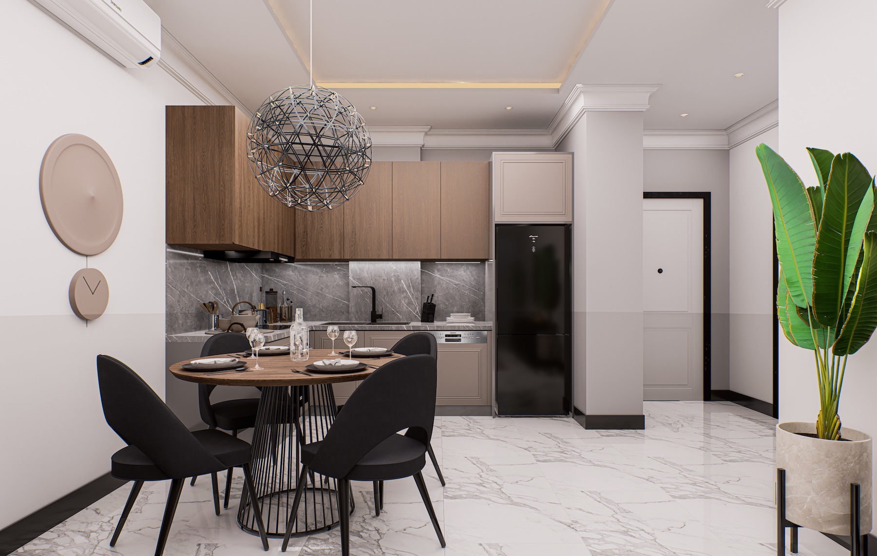 The apartments and villas will be delivered with quality flooring, lighting, fitted kitchen furniture and fitted bathrooms.