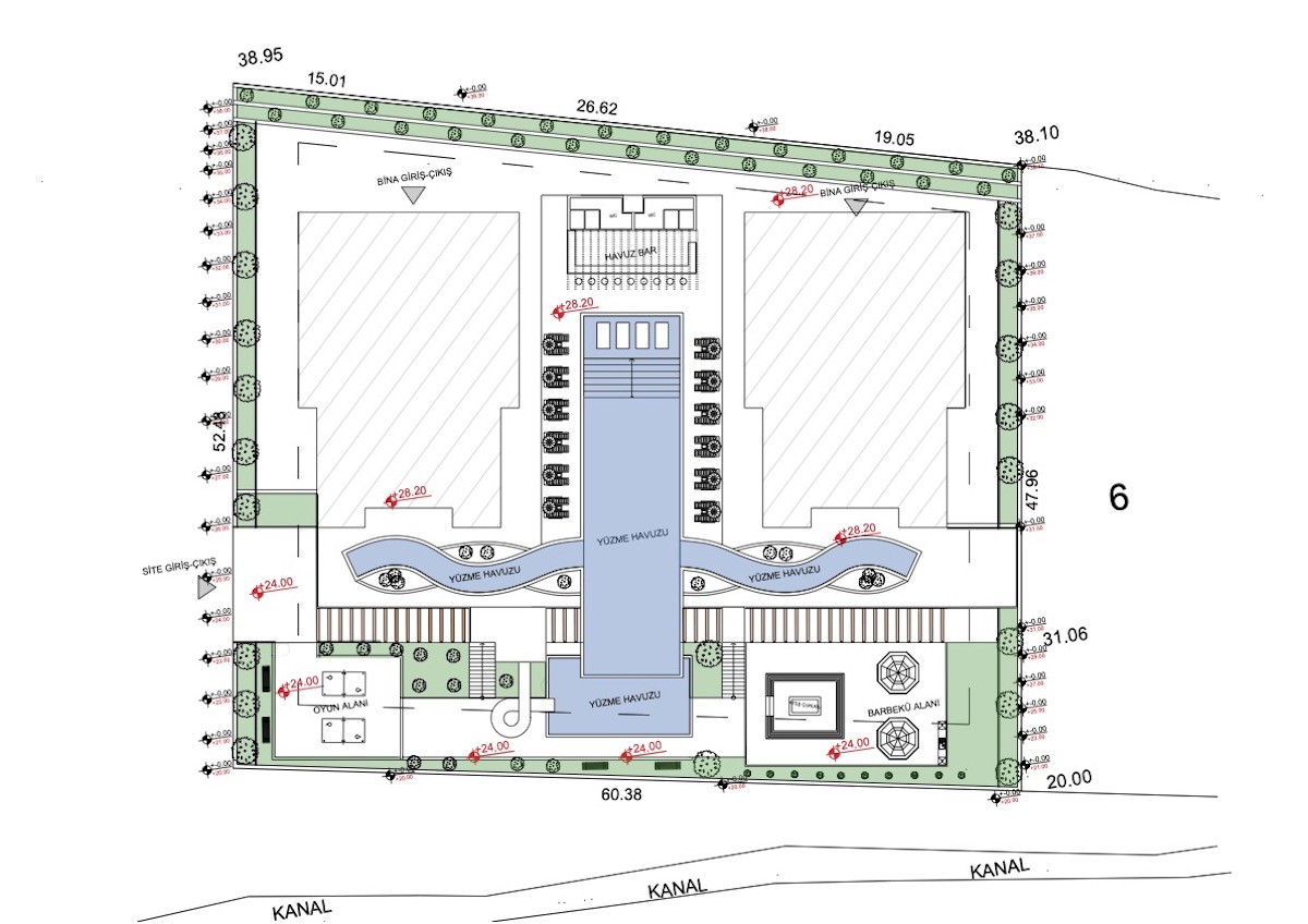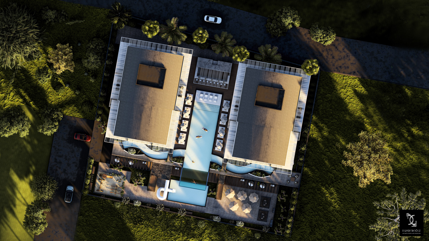 Kompleks, alışılmadık ve güzel bir şekilde donatılmış bir havuz alanına sahiptir. Kanallar sağda ve solda havuza akarak ön tarafta sonsuzluk etkisi sağlayacak bir şelale oluşturmaktadır.