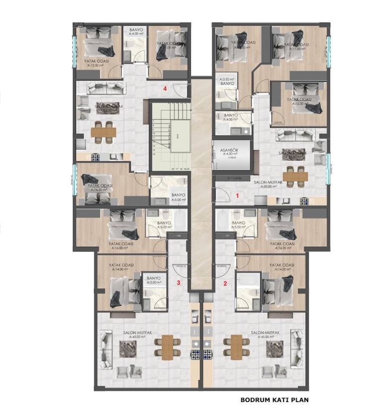 Alt katlarda ofis için uygun daireler ve site ortak kullanım alanları bulunmaktadır. Konut katları ikinci kattan başlamaktadır.