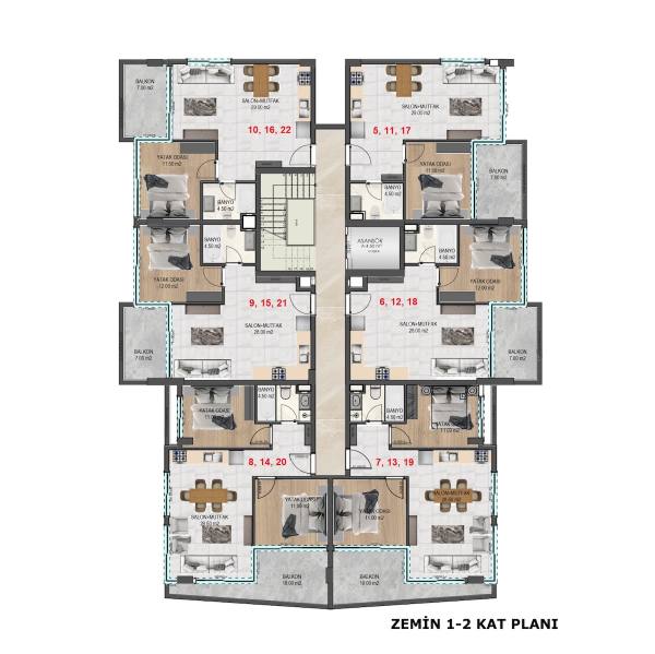 3030 m2 kapalı peyzajlı alanda 5’er katlı iki blokta 1+1, 2+1, 3+1, 2+1 ve 3+1 penthouse olmak üzere çeşitli yerleşim planlarında 58 daire bulunmaktadır. Projede sunulan 1+1 daireler geniş panoramik camları sayesinde bol ışık almaktadır. Daireler, ankastre mutfak ve sıhhi tesisat ve banyo dolaplarıyla donatılmış bir şekilde teslim edilecektir.