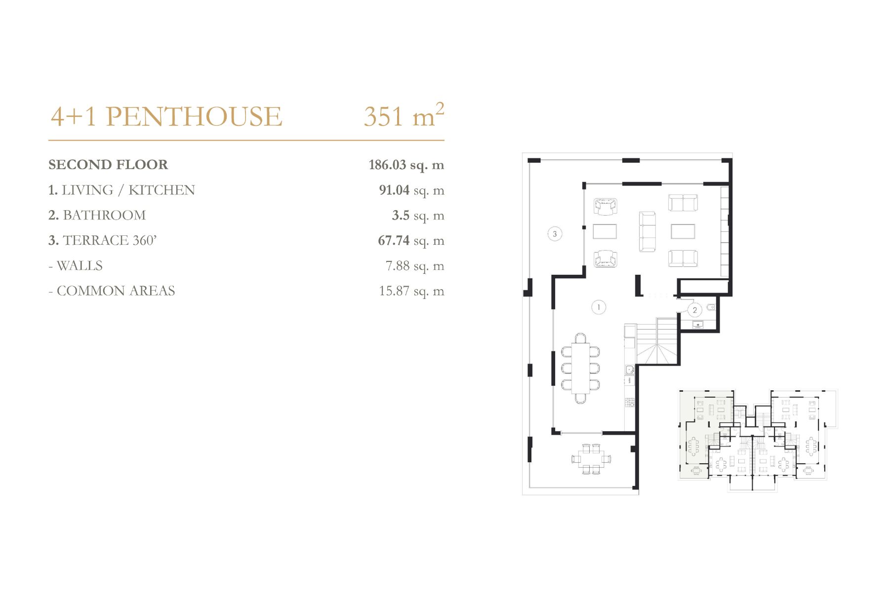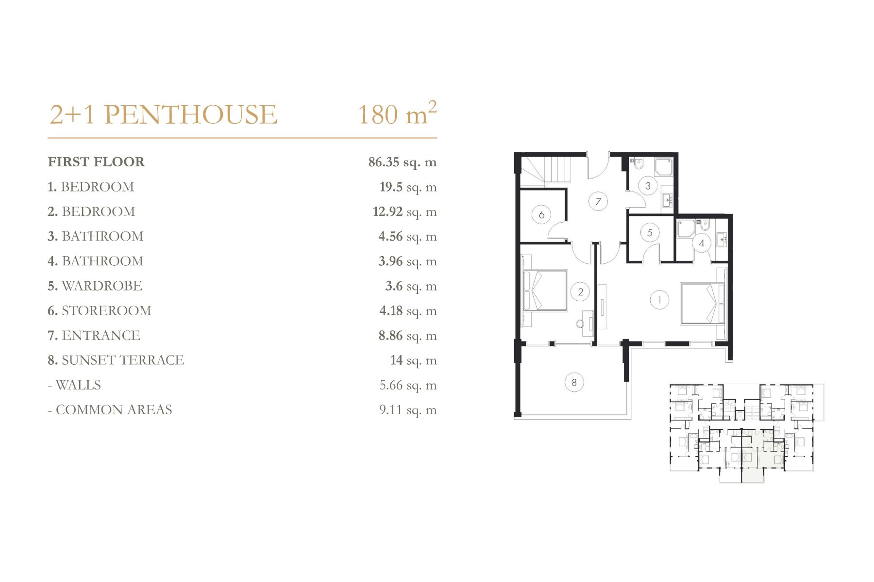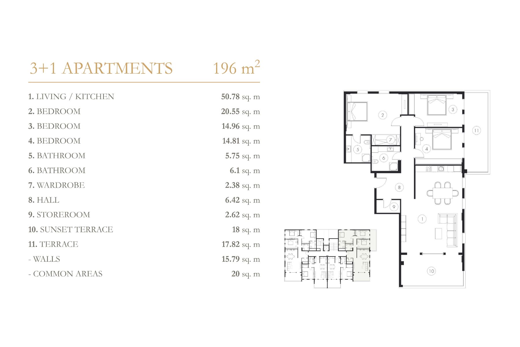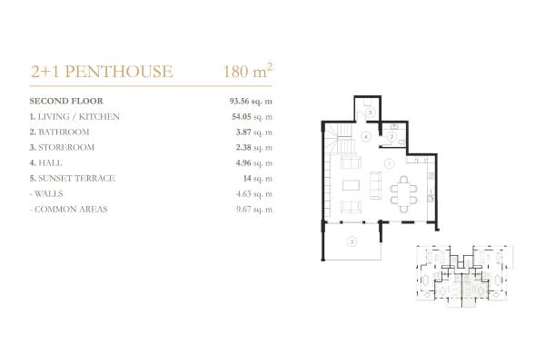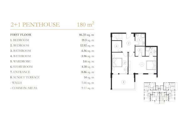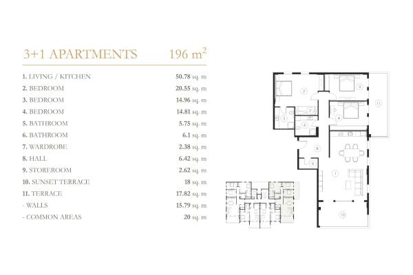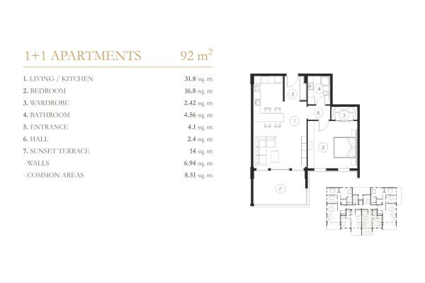 Komplekste 1+1 ve 3+1 daireler, 2+1 ve 4+1 çatı katlarından oluşan 148 daire ve 40 villa bulunmaktadır. Hemen hemen tüm daireler Akdeniz'e bakmaktadır. Her daire 14-18 m2 büyüklüğünde 1 veya 2 terasa sahiptir. Çatı katı sakinleri için garaj da mevcuttur.