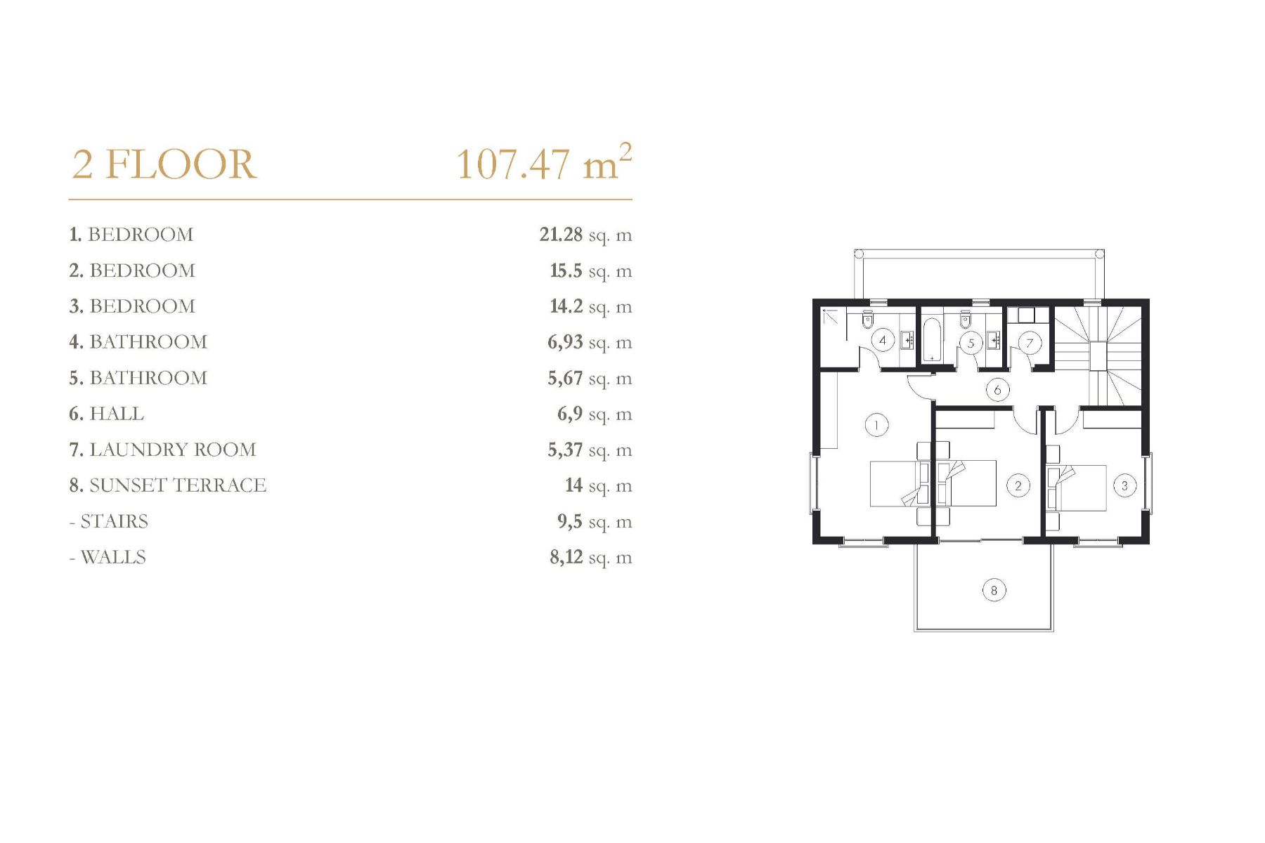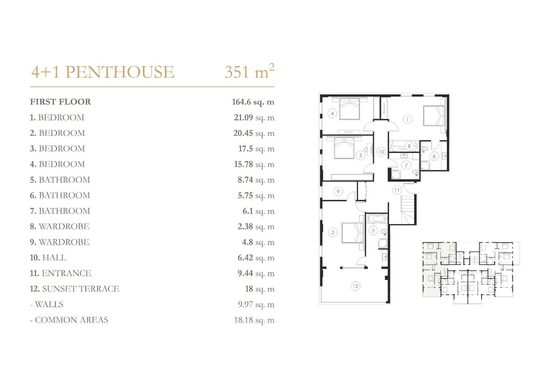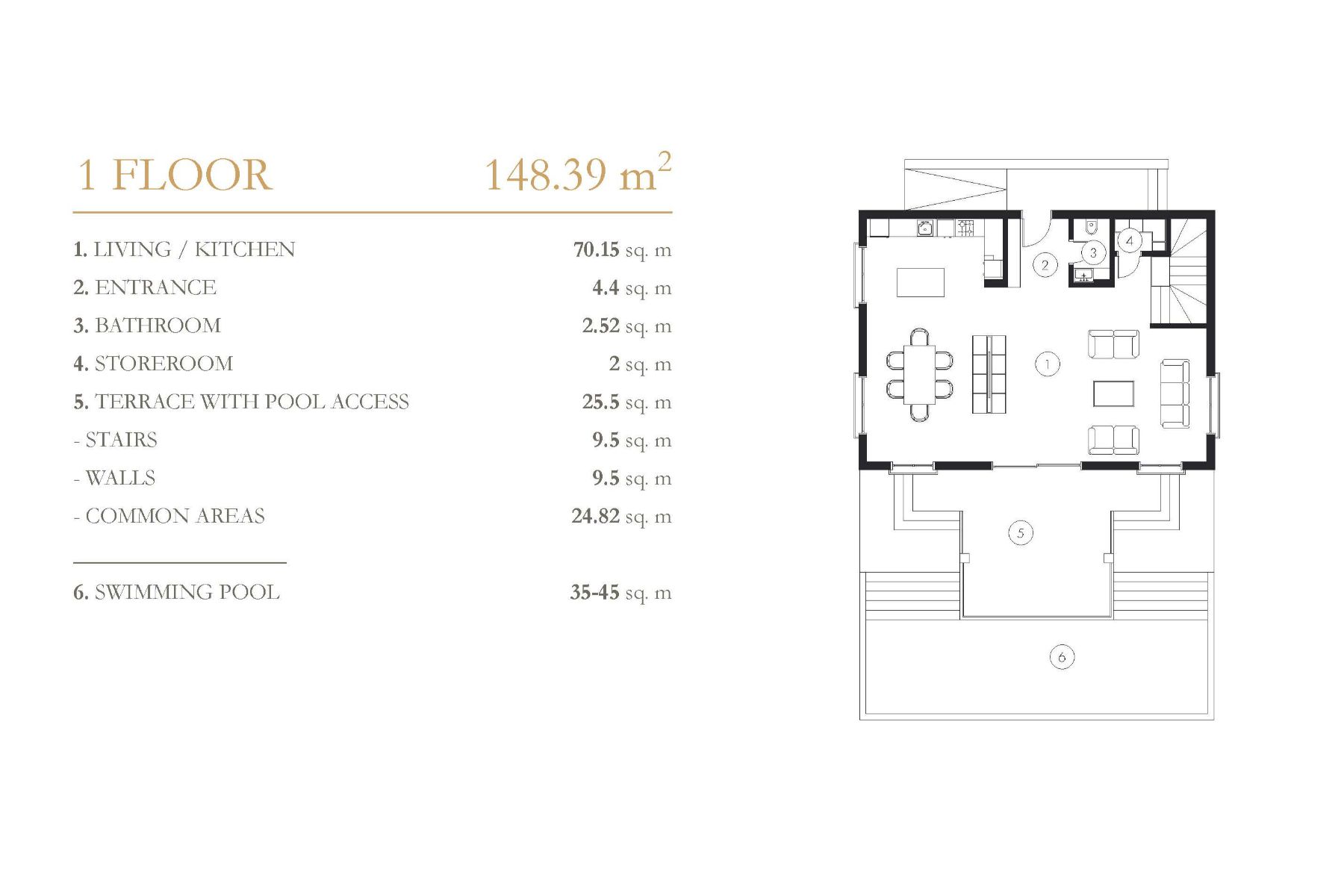 Komplekste 1+1 ve 3+1 daireler, 2+1 ve 4+1 çatı katlarından oluşan 148 daire ve 40 villa bulunmaktadır. Hemen hemen tüm daireler Akdeniz'e bakmaktadır. Her daire 14-18 m2 büyüklüğünde 1 veya 2 terasa sahiptir. Çatı katı sakinleri için garaj da mevcuttur.