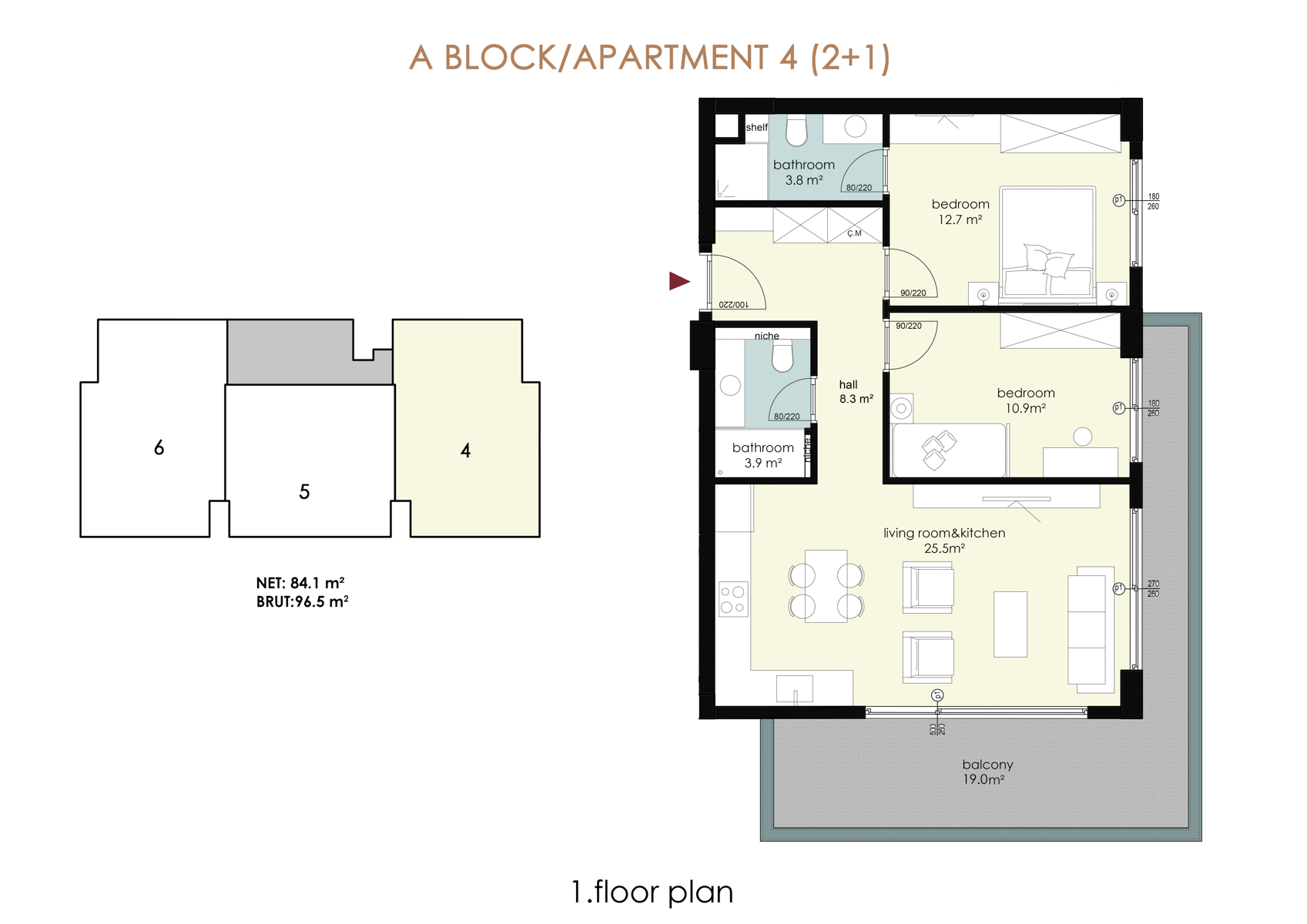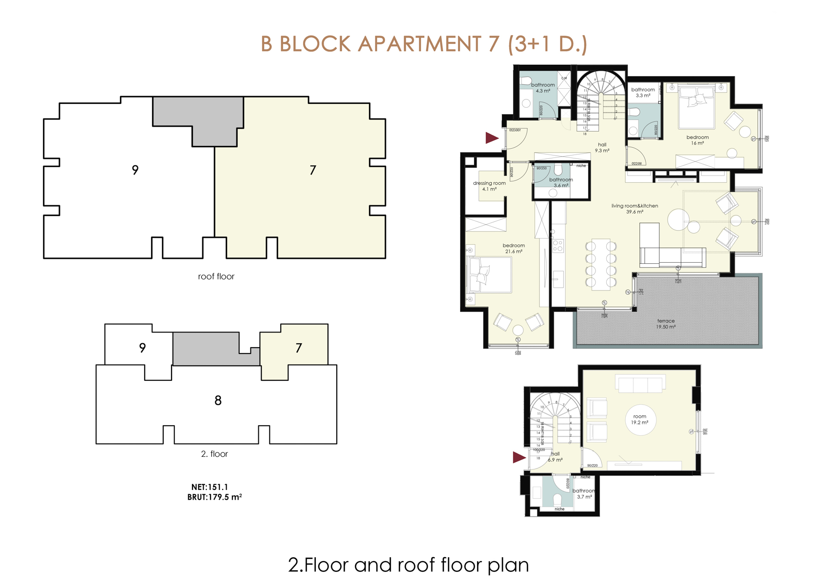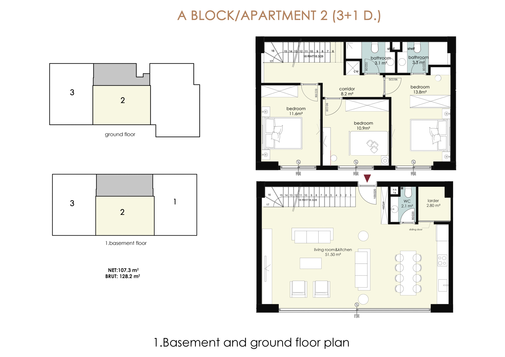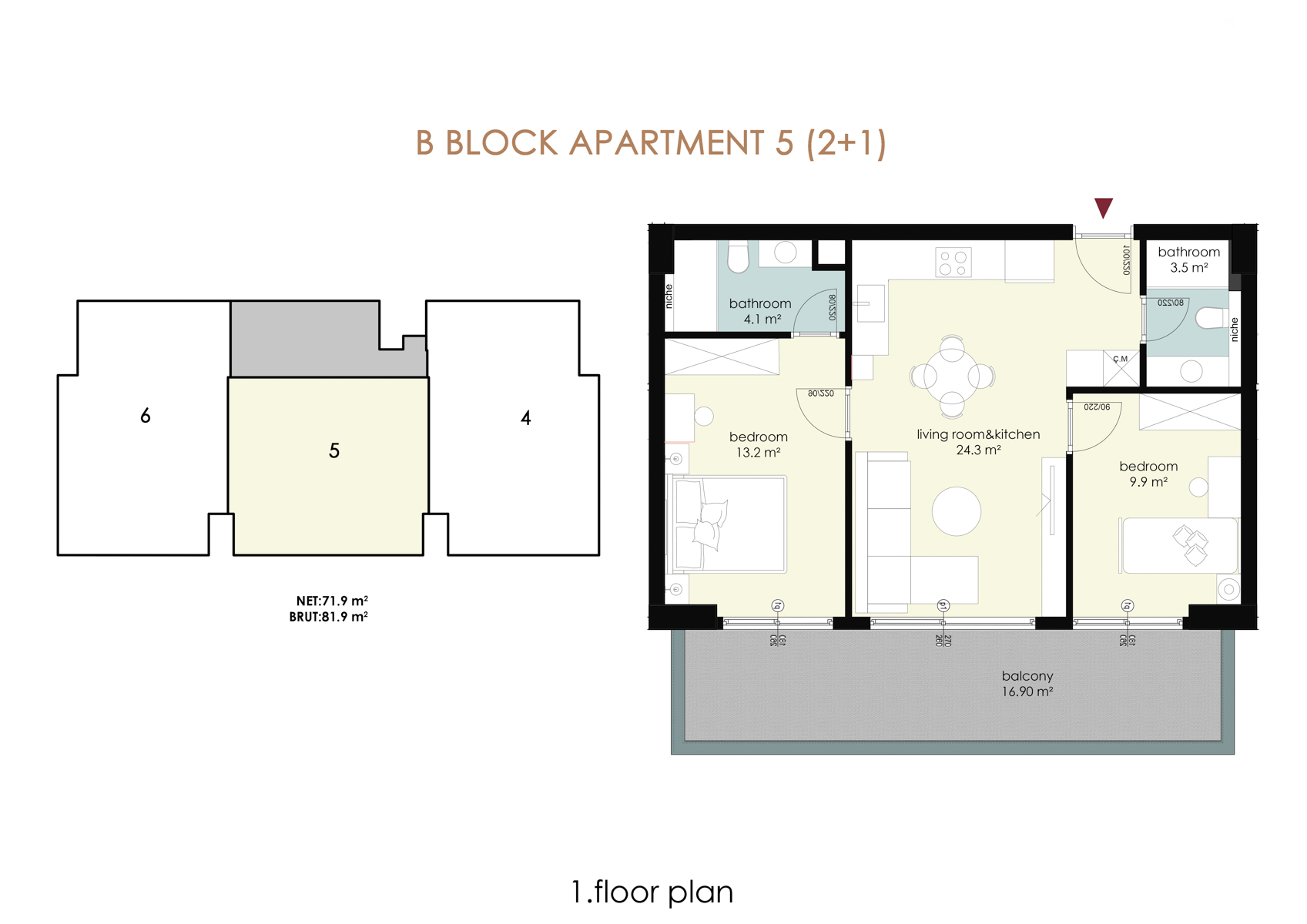 Kompleksteki 2+1 daireler (2 yatak odası ve açık mutfaklı oturma odası), 3+1 dubleks daireler (3 yatak odası ve açık mutfaklı oturma odası) kaliteli yer döşemeleri, ankastre mutfak dolapları ve eksiksiz banyolarla teslim edilecektir. Görüntülü diafon ve banyolarda yerden ısıtma mevcuttur.