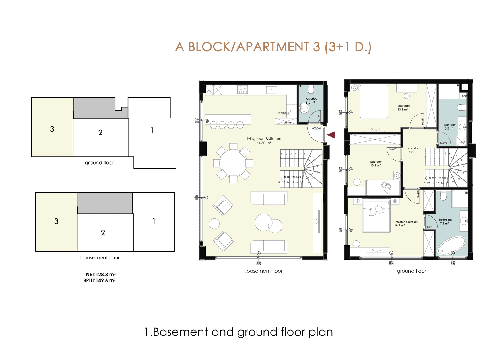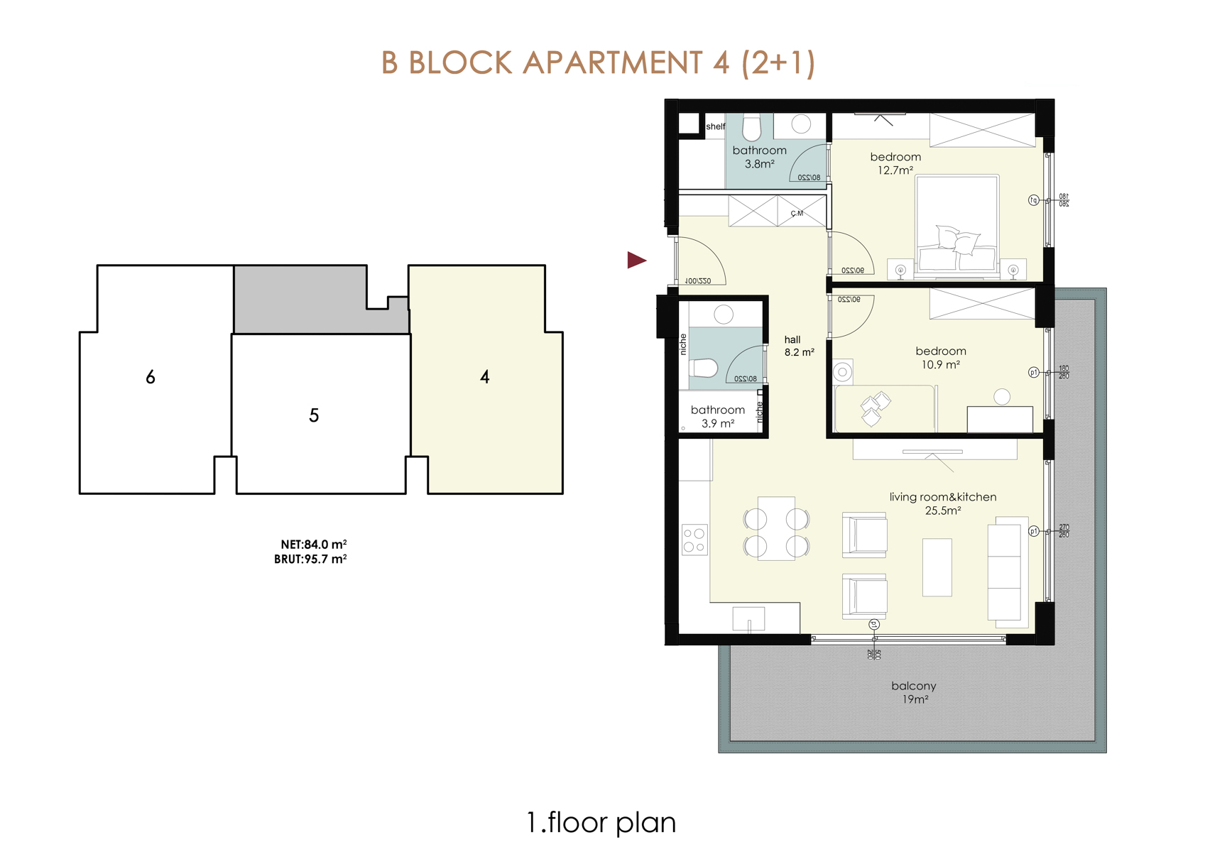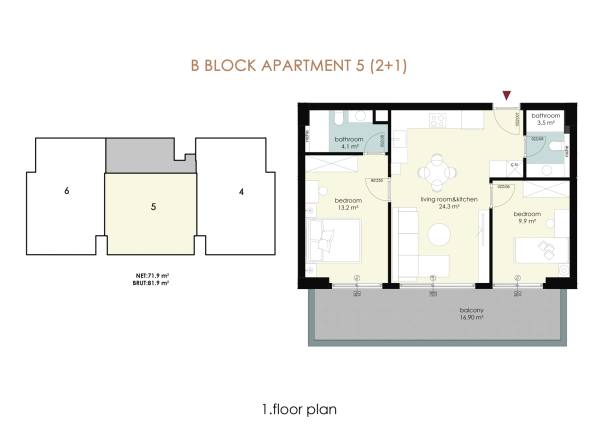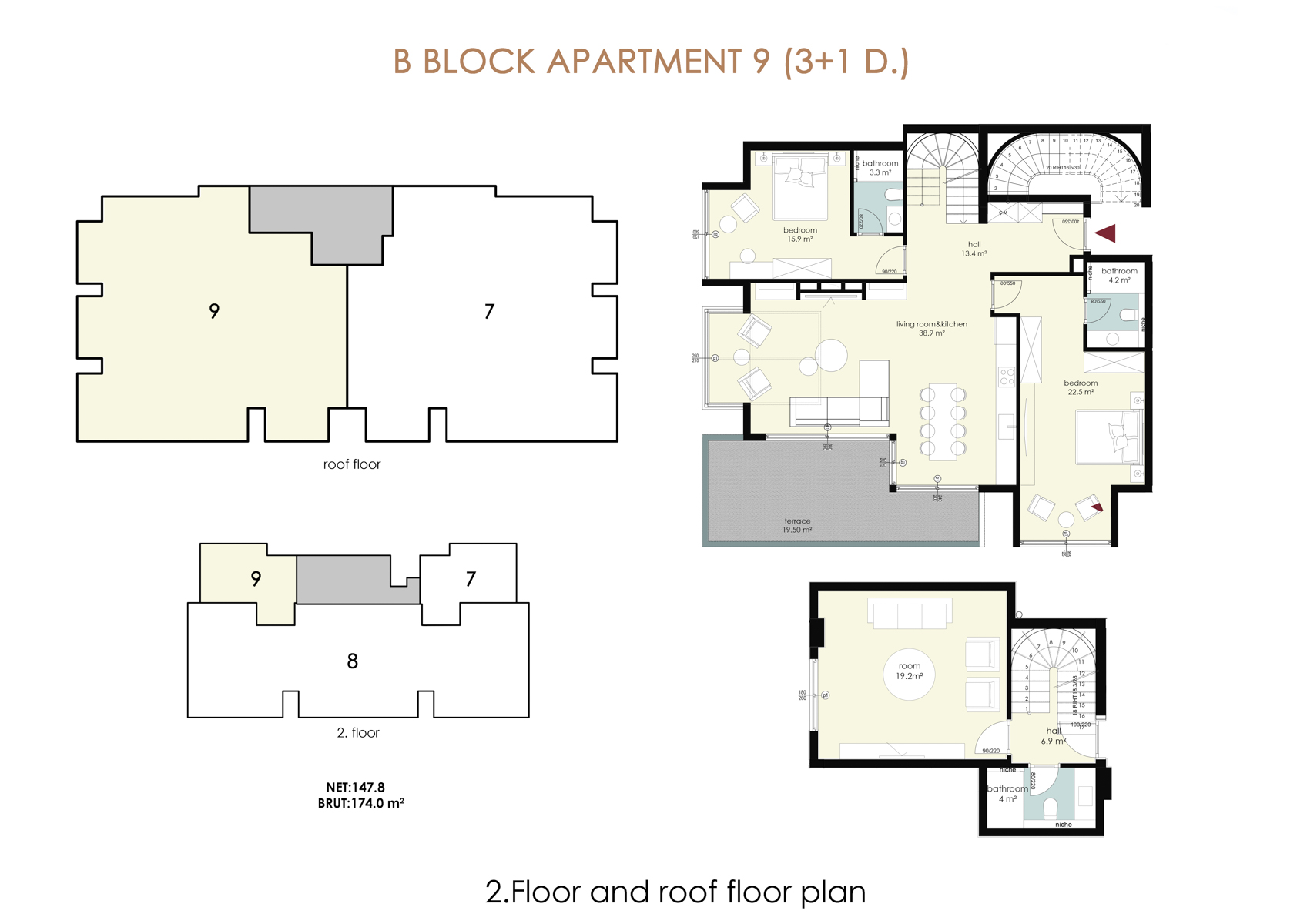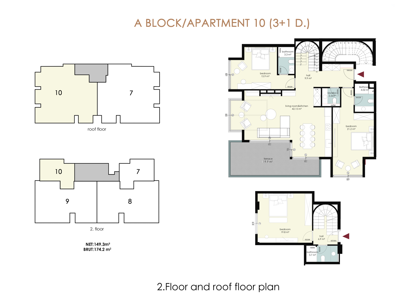Kompleksteki 2+1 daireler (2 yatak odası ve açık mutfaklı oturma odası), 3+1 dubleks daireler (3 yatak odası ve açık mutfaklı oturma odası) kaliteli yer döşemeleri, ankastre mutfak dolapları ve eksiksiz banyolarla teslim edilecektir. Görüntülü diafon ve banyolarda yerden ısıtma mevcuttur.