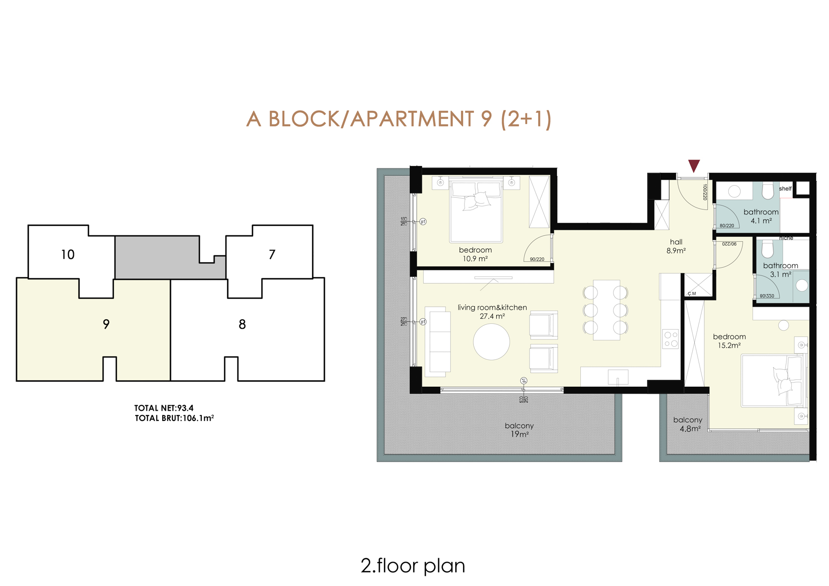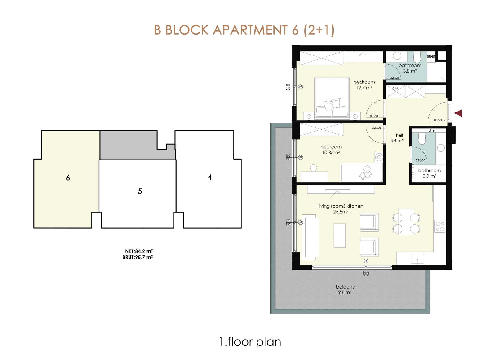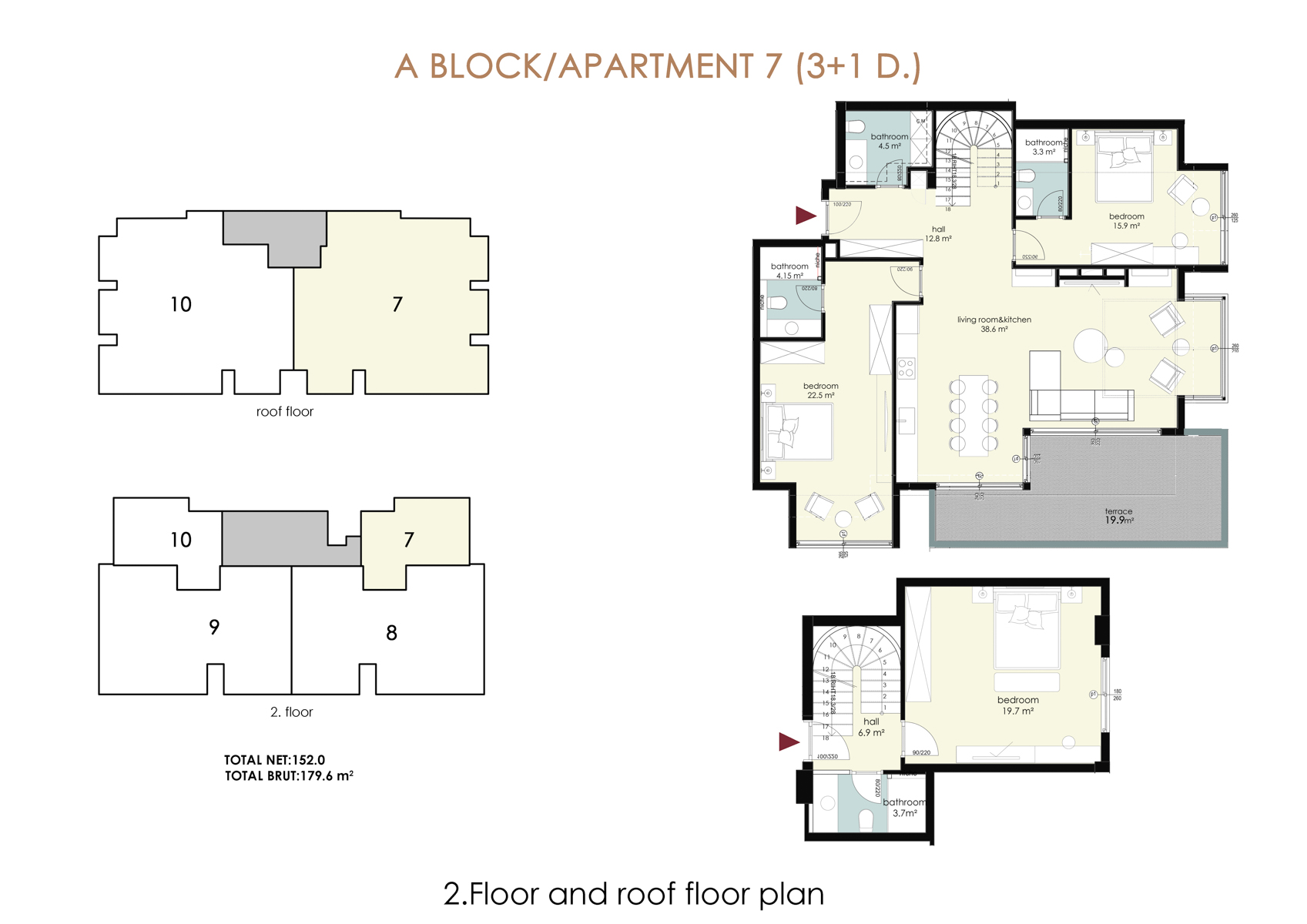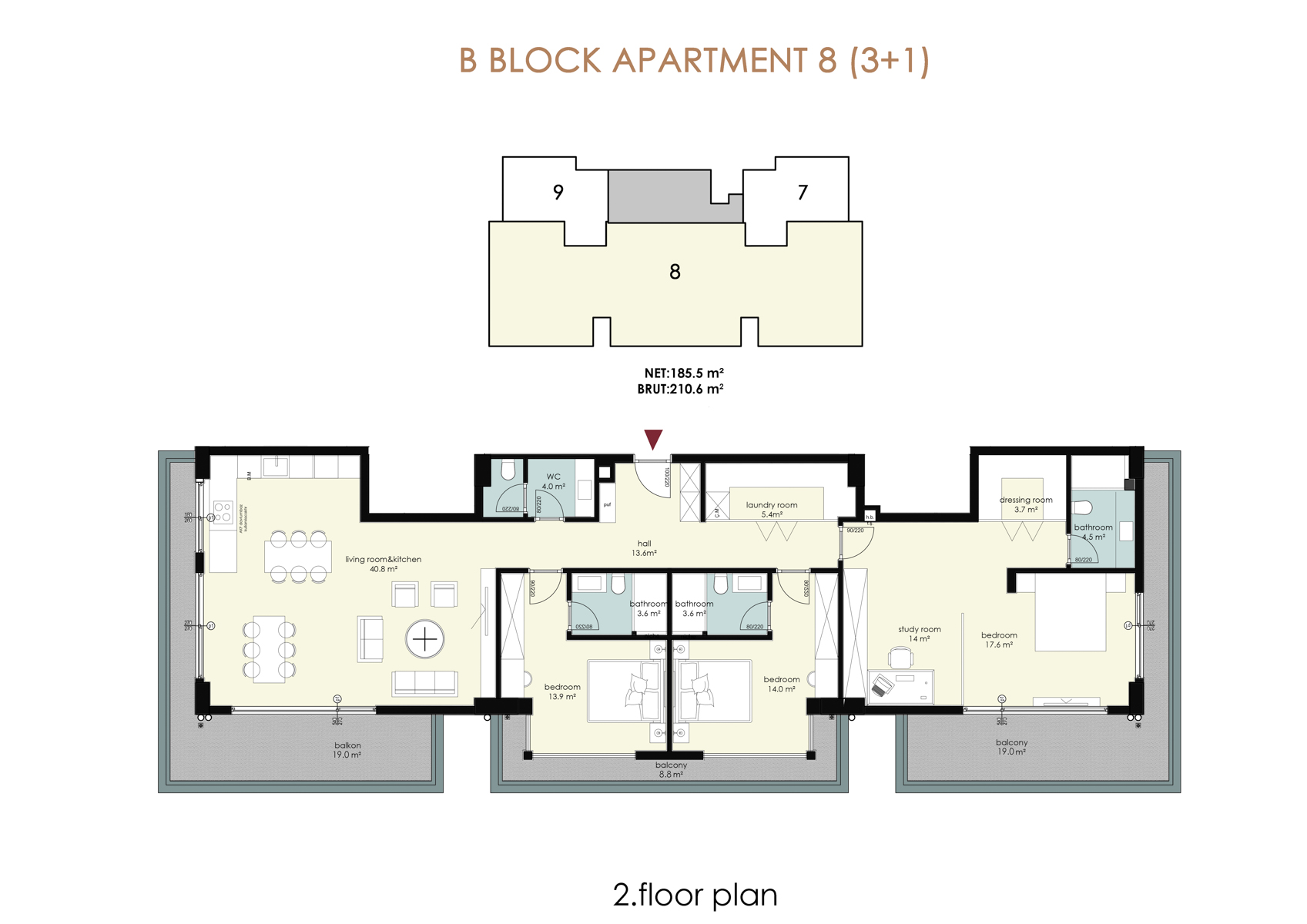Kompleksteki 2+1 daireler (2 yatak odası ve açık mutfaklı oturma odası), 3+1 dubleks daireler (3 yatak odası ve açık mutfaklı oturma odası) kaliteli yer döşemeleri, ankastre mutfak dolapları ve eksiksiz banyolarla teslim edilecektir. Görüntülü diafon ve banyolarda yerden ısıtma mevcuttur.