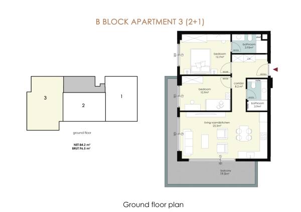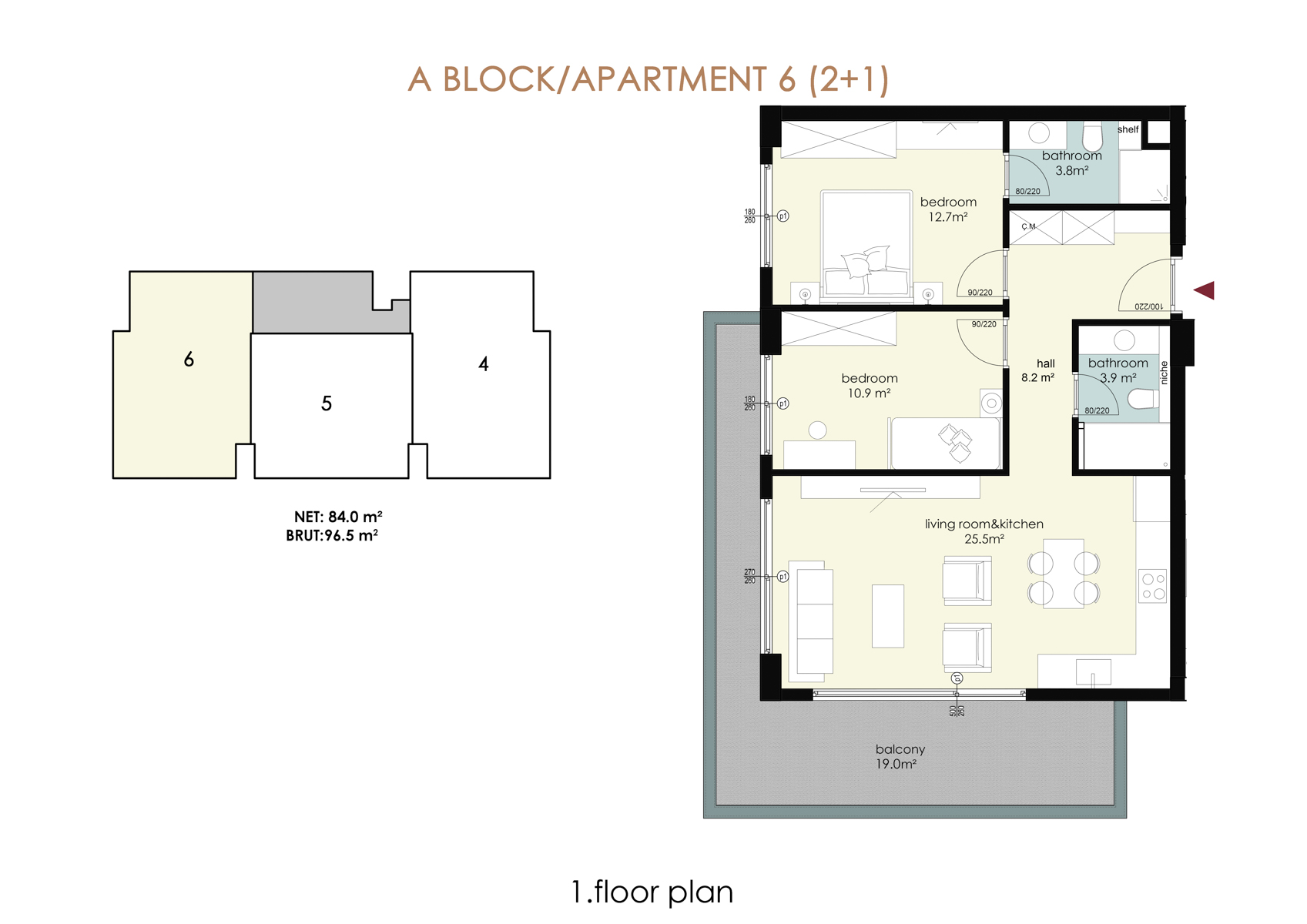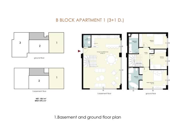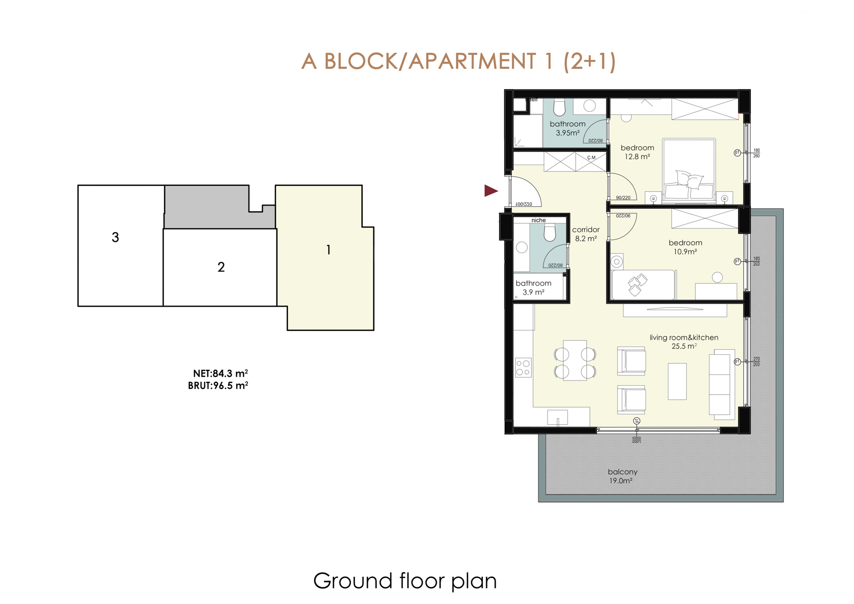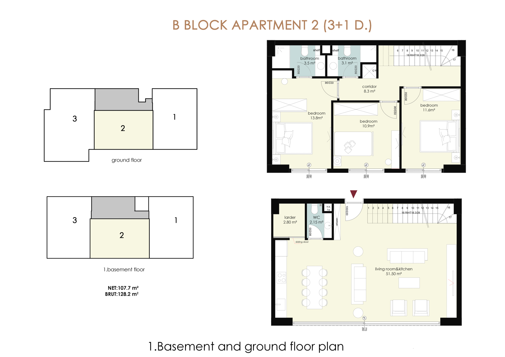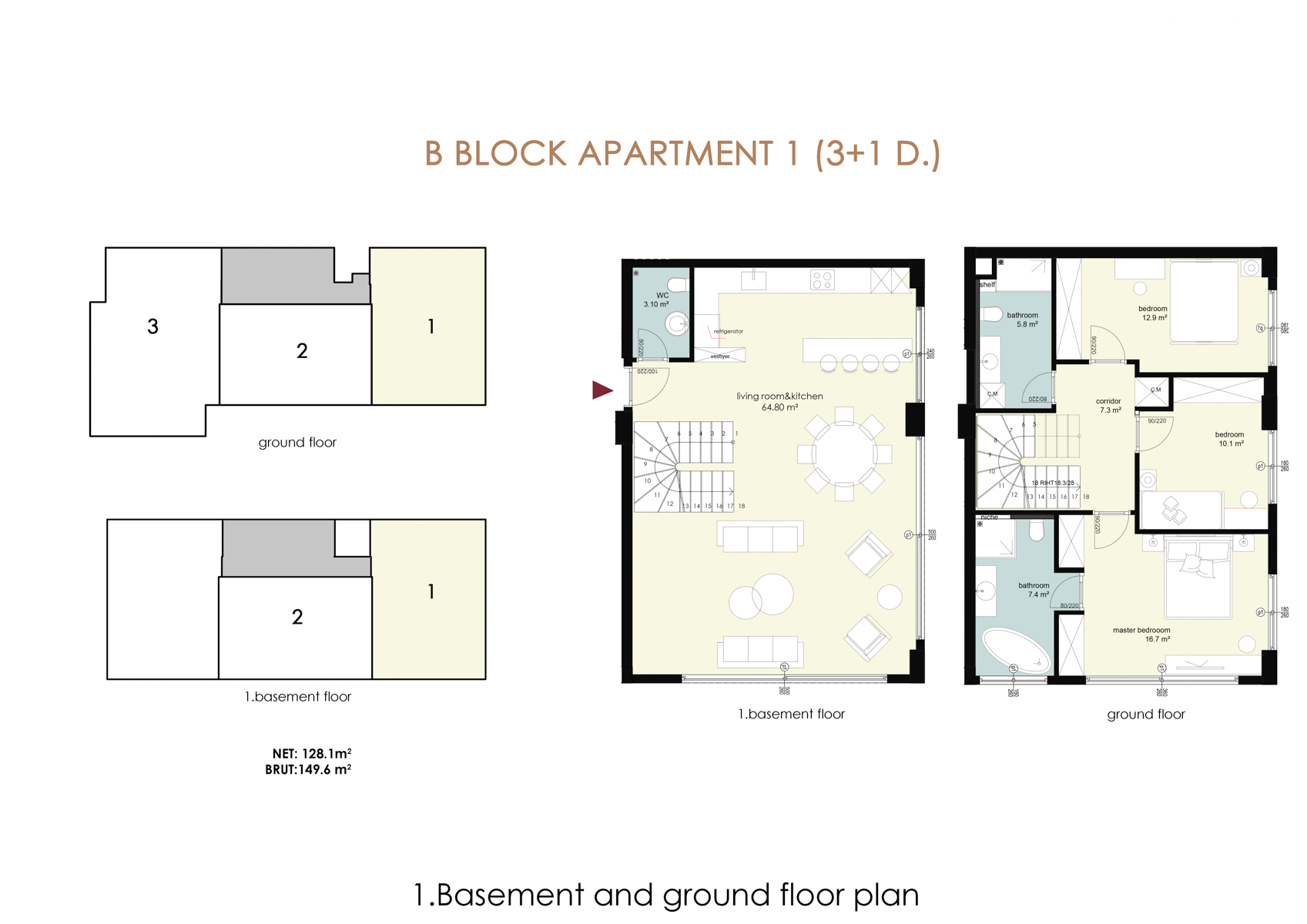 Kompleksteki 2+1 daireler (2 yatak odası ve açık mutfaklı oturma odası), 3+1 dubleks daireler (3 yatak odası ve açık mutfaklı oturma odası) kaliteli yer döşemeleri, ankastre mutfak dolapları ve eksiksiz banyolarla teslim edilecektir. Görüntülü diafon ve banyolarda yerden ısıtma mevcuttur.