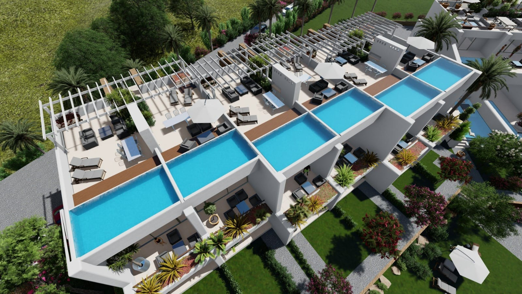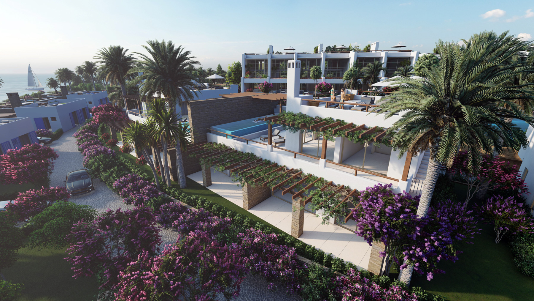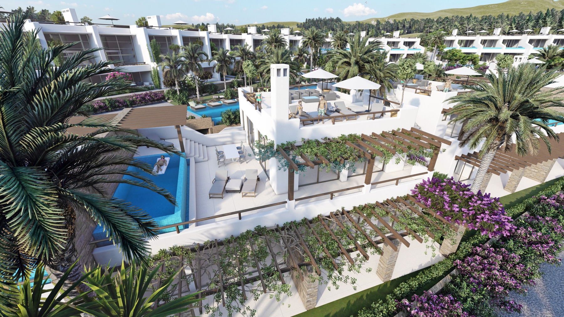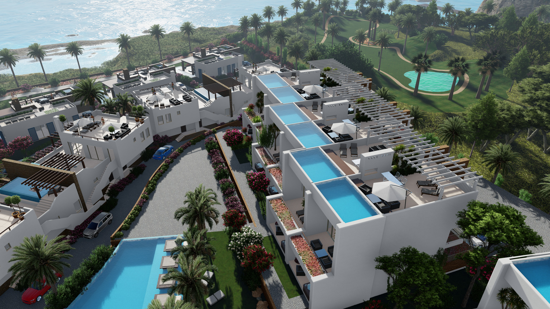 Yunan tarzı mimari tasarımı ile komplekste şık bir tatil beldesi havası yaratılmıştır. 8 adet 3+1 villa ve 72 adet 1+1, 2+1 ve 3+1 düzeninde daire bulunmaktadır. Çatıda çatı havuzu, sonsuzluk havuzu, barbekü alanı ve jakuzili çatı katları bulunmaktadır. Villalar ortak ve özel havuzlu olmak üzere 2 tipe ayrılmıştır. Ortak havuzlu villaların kendilerine ait küçük bir koyları bulunmaktadır. Villaların alt katlarında jakuzi bulunmaktadır.