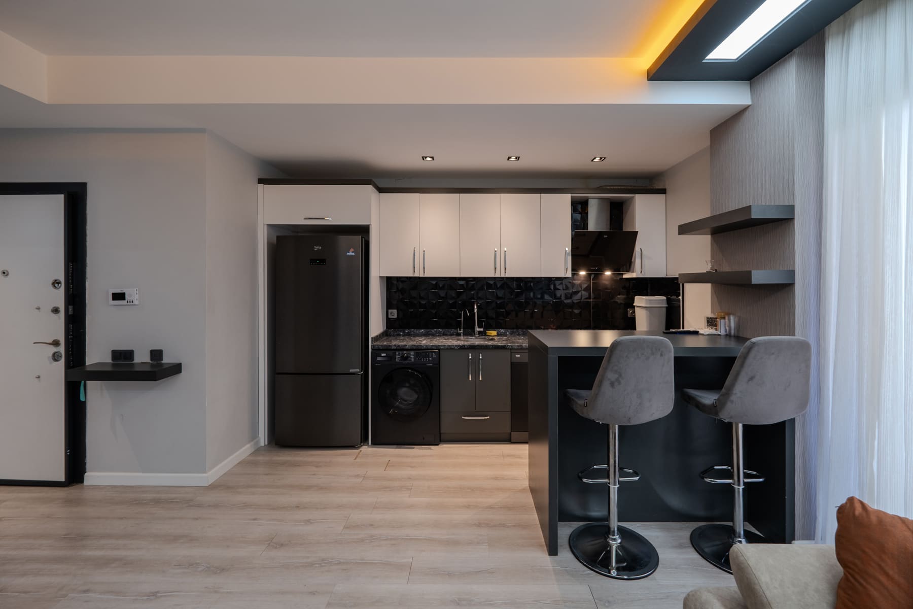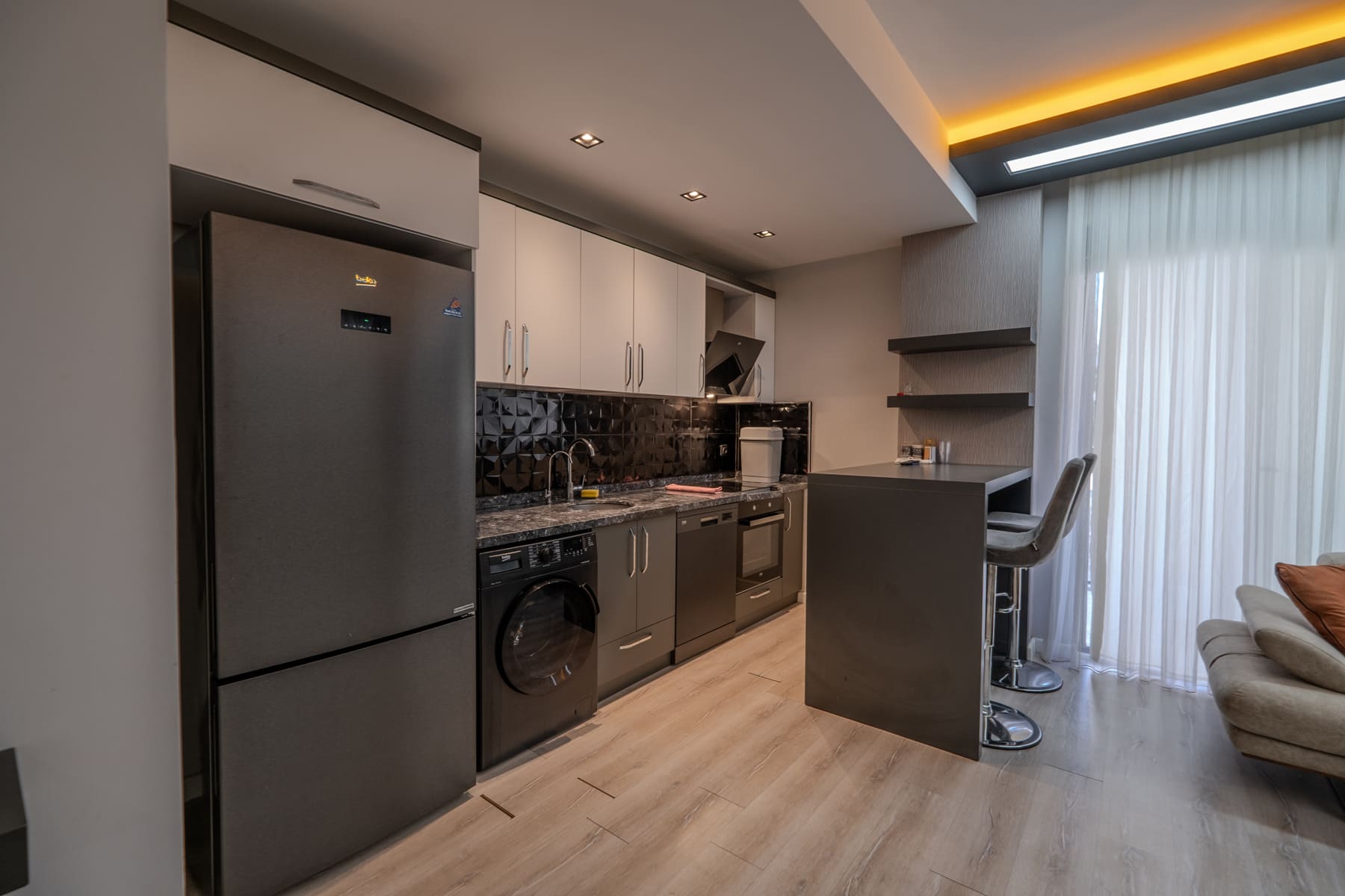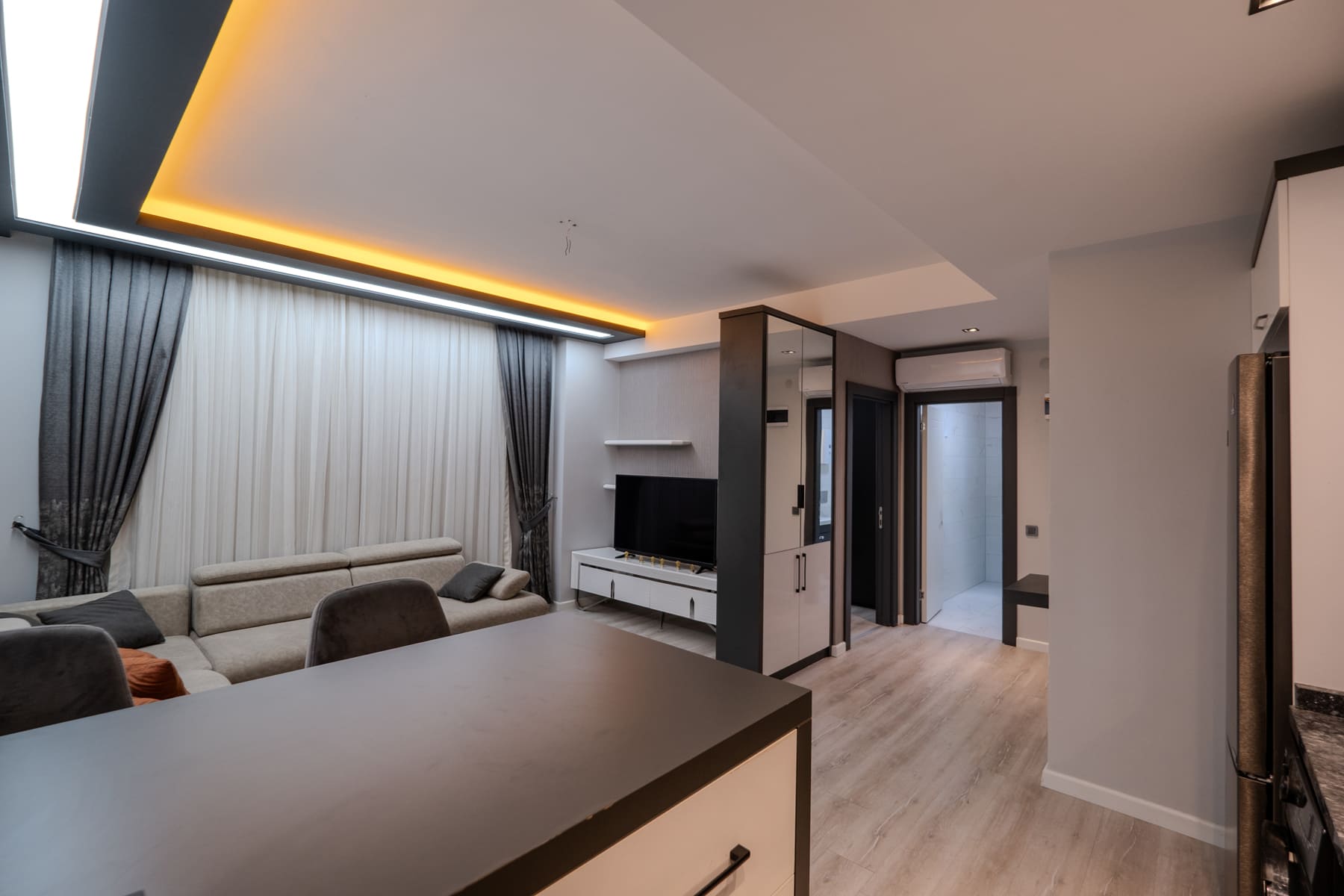 Daire eşyalı olup klima, TV ve gerekli beyaz eşyalar mevcuttur. Açık mutfaklı salon, 1 yatak odası ve balkon bulunmaktadır. Kullanımı rahat ve ferah bir dairedir.