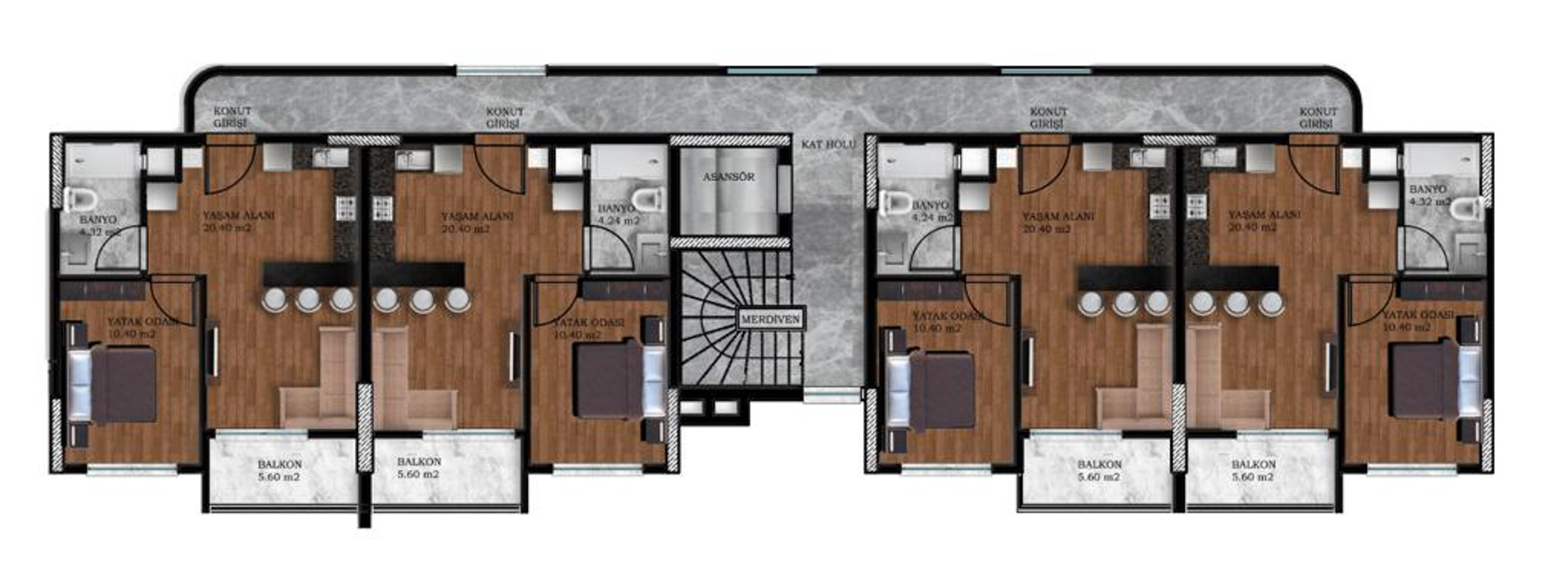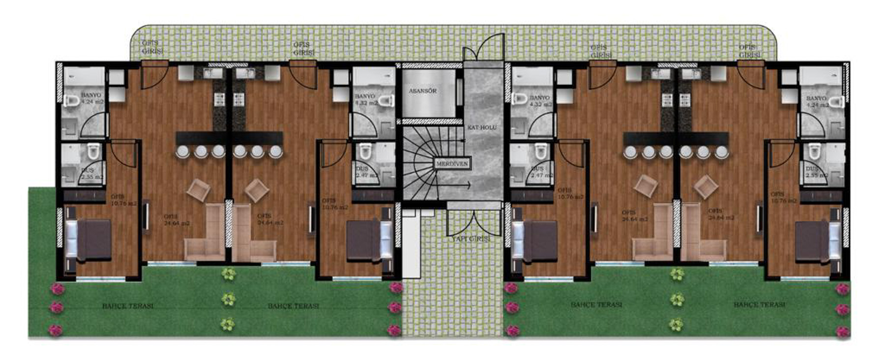 Новостройка представляет собой 2 пятиэтажных блока с квартирами планировок 1+1 и 1+1 с садом. Апартаменты сдаются с качественной чистовой отделкой, укомплектованными ванными комнатами и встроенными кухонными гарнитурами.