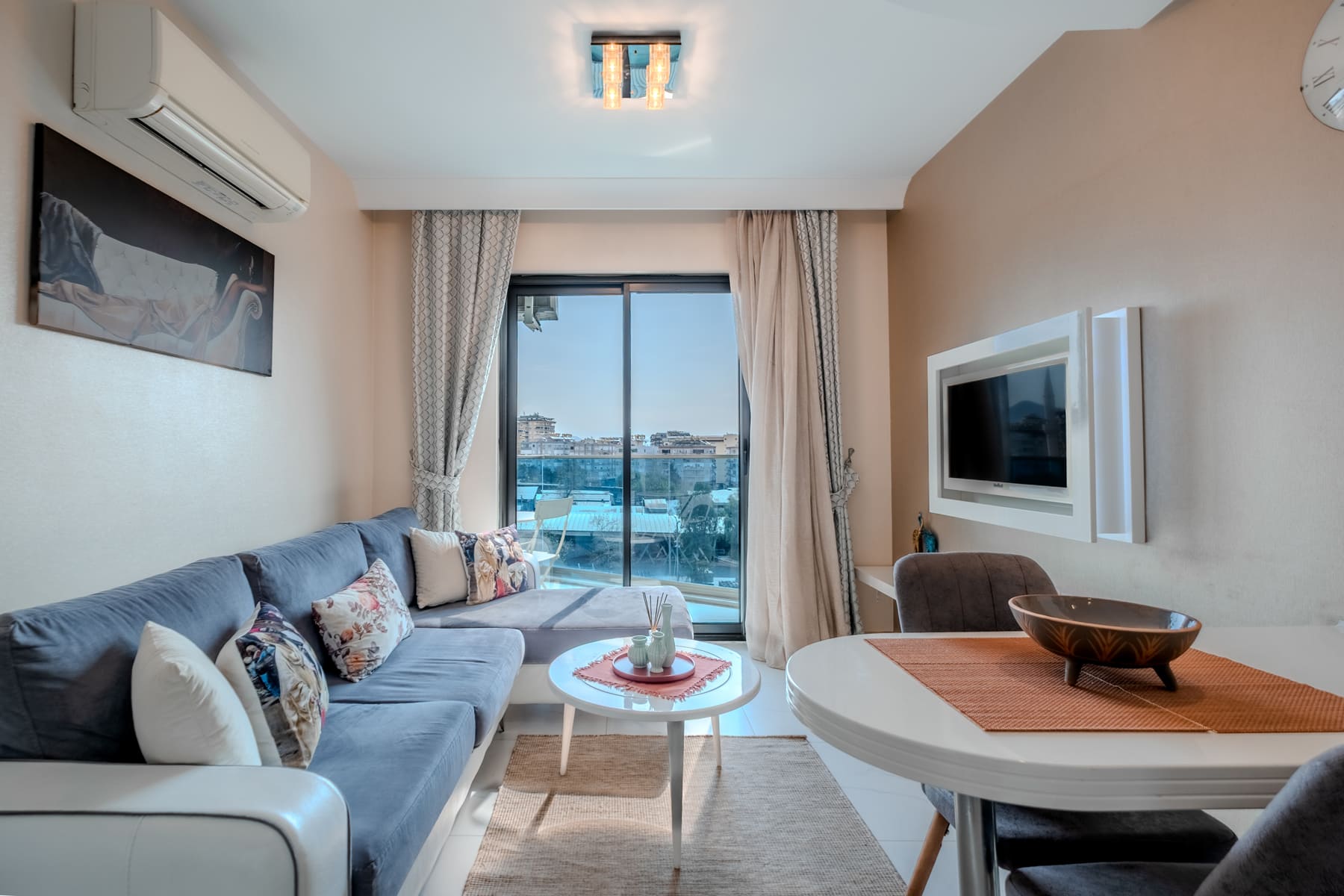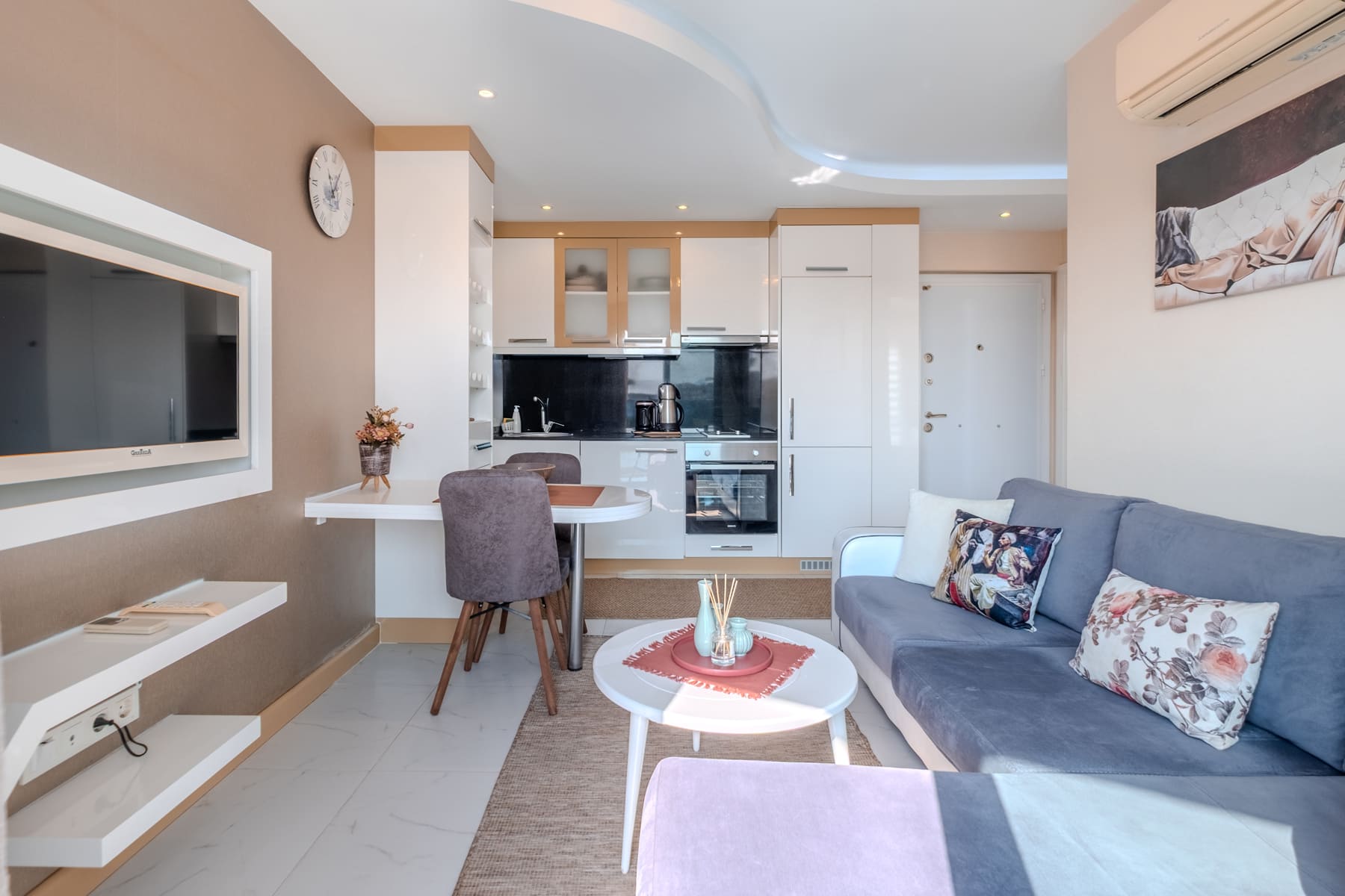 Современная и стильно меблированная квартира 1+1 сдается в аренду в самом центре Аланьи. Квартира состоит из гостиной с кухней открытого типа, спальни и балкона. Полностью готова к проживанию, оснащена всей бытовой техникой, мебелью и декоративными элементами.